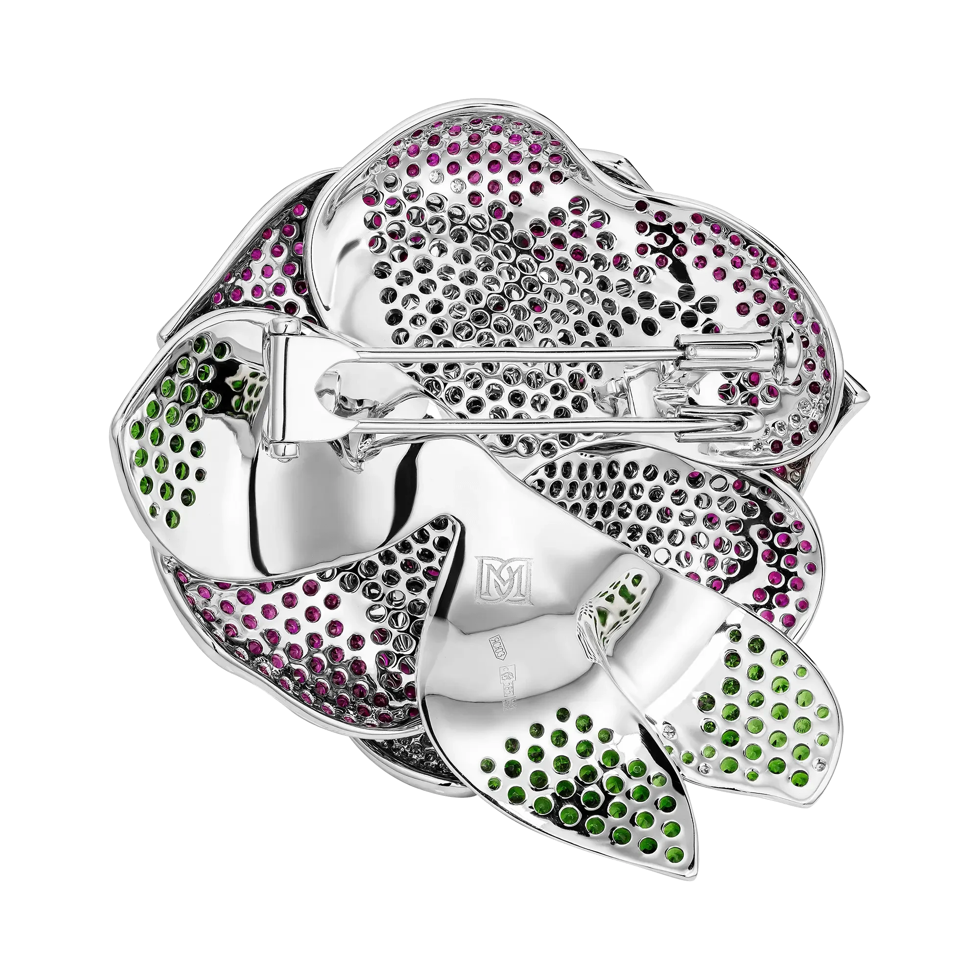 Распускающаяся роза, ставшая формой броши, раскрывается как символ притяжения и обновления. Более пятисот рубинов, расшитых по лепесткам, создают бархатистую поверхность и насыщенный алый оттенок, в котором ощущаются тепло и движение. Восемьдесят пять тсаворитов вносят свежий зелёный акцент, словно напоминание о живой природе, окружающей цветок в мягкой полутени сада.