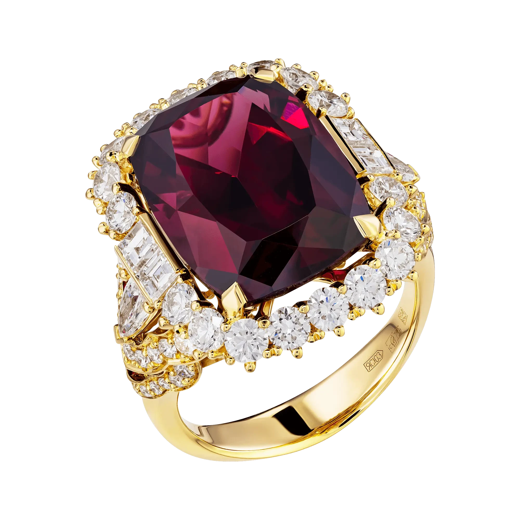 Центральное звучание принадлежит родолитам общим весом 46,19 карат – насыщенным, глубоким, с винно-пряным оттенком. Эти самоцветы словно вобрали в себя жар пустыни и прохладу дворцовых садов. В кольце крупный камень обрамлён бриллиантами и уравновешен архитектурной симметрией.