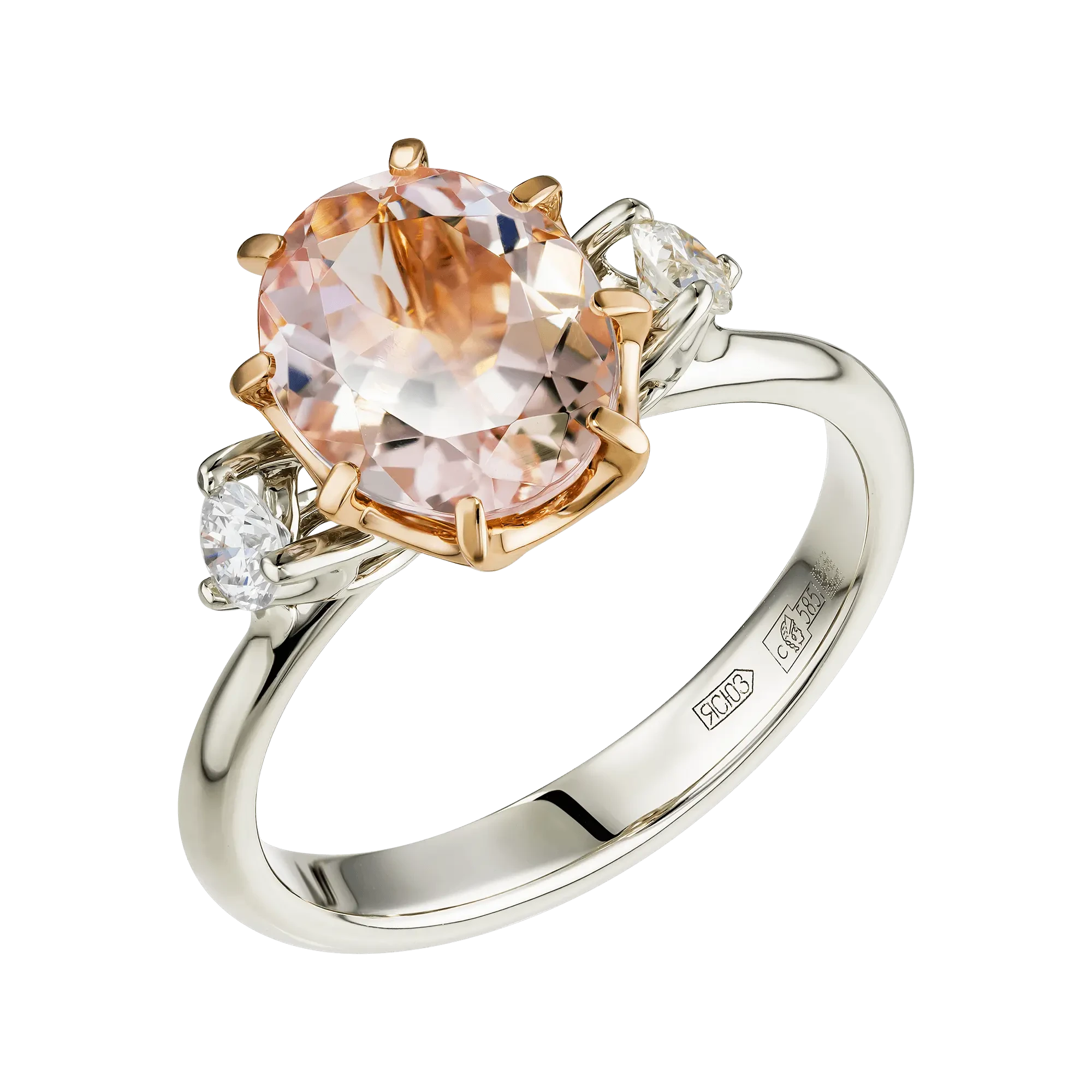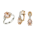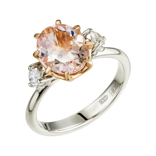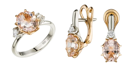 Центральными акцентами композиции стали морганиты нежно-розового оттенка, обладающие высокой прозрачностью и деликатным свечением. Природные камни из берилловой группы ценятся за утончённую палитру, в которой цвет раскрывается мягко и глубоко. В обрамлении красного золота оттенок камней становится теплее и насыщеннее, приобретая живое, телесное звучание. Белое золото вводит в композицию контраст, подчёркивая чистоту цвета и придавая украшению графичность.
