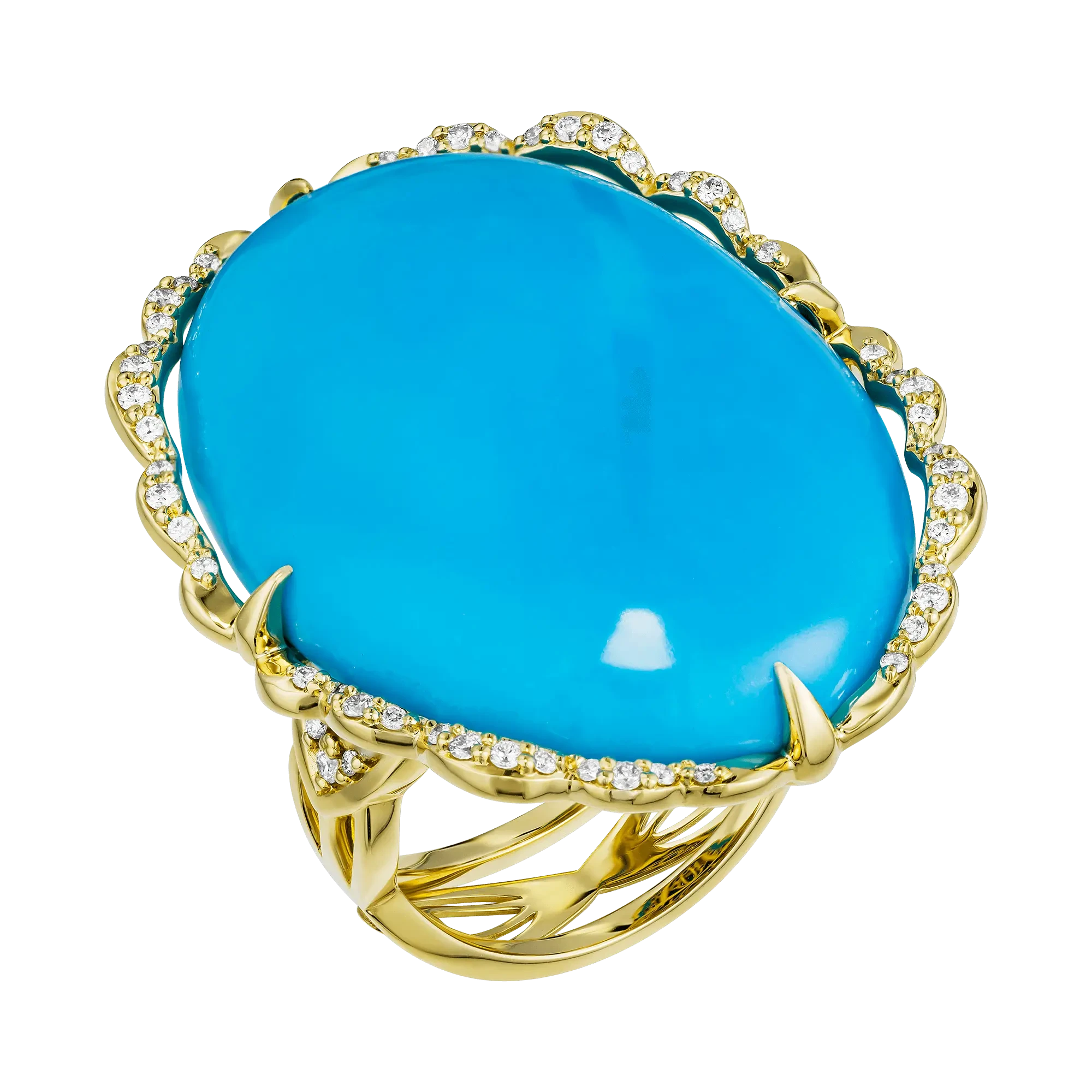 Бирюза заключена в ажурную оправу из жёлтого золота, линии которой образуют изысканный орнамент, придающий украшению лёгкость и выразительность. Россыпь бриллиантов добавляет композиции искристые вспышки света, усиливая контраст с мягкими небесными оттенками самоцветов.