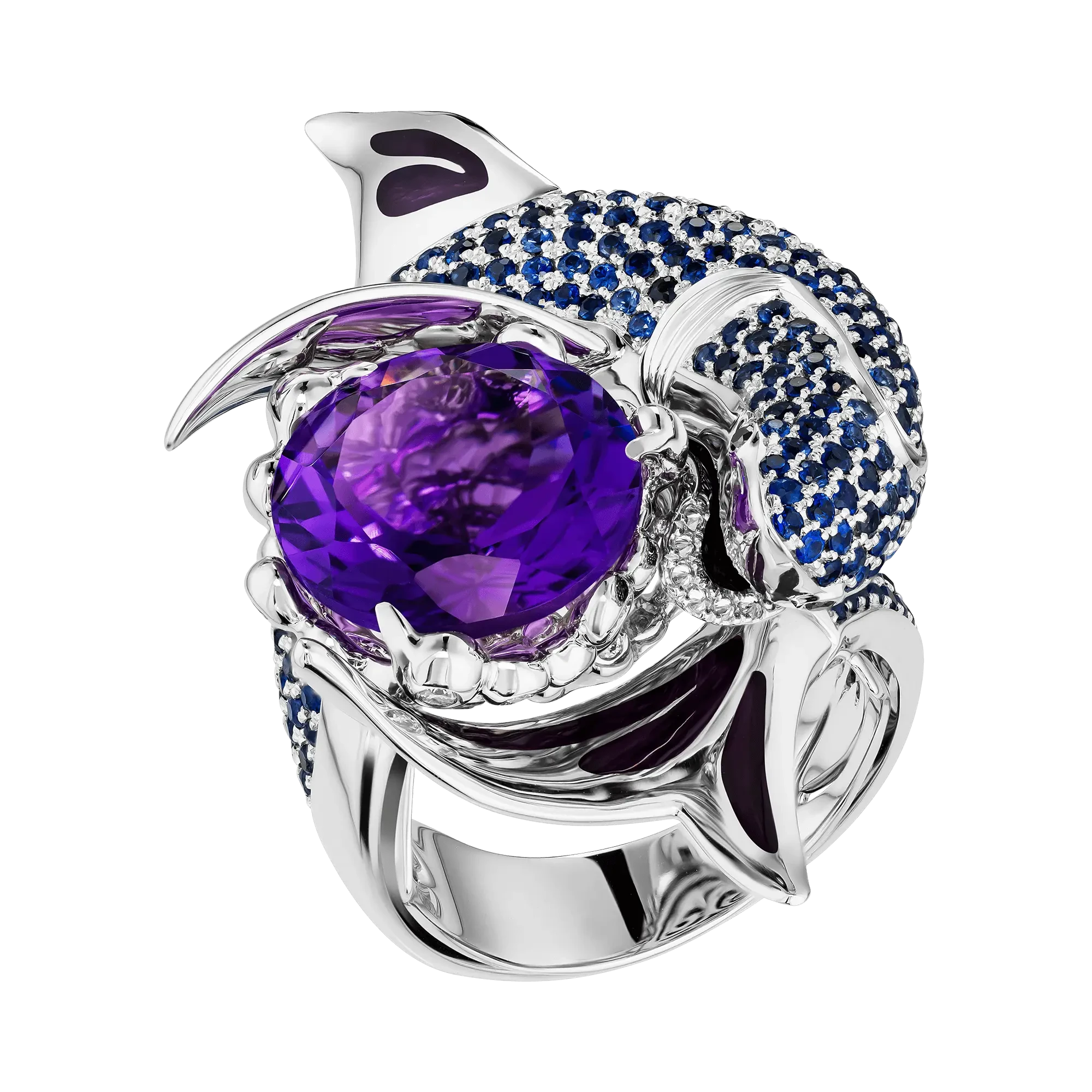 Центральный бразильский аметист с насыщенным фиолетовым тоном формирует сердцевину композиции, становясь источником внутреннего напряжения и притягательной мистики. Его цвет вступает в диалог с холодным сиянием белого золота, усиливая ощущение глубины и скрытого движения. Бриллианты, расположенные в основании, направляют свет внутрь камня, создавая эффект живого, пульсирующего свечения.