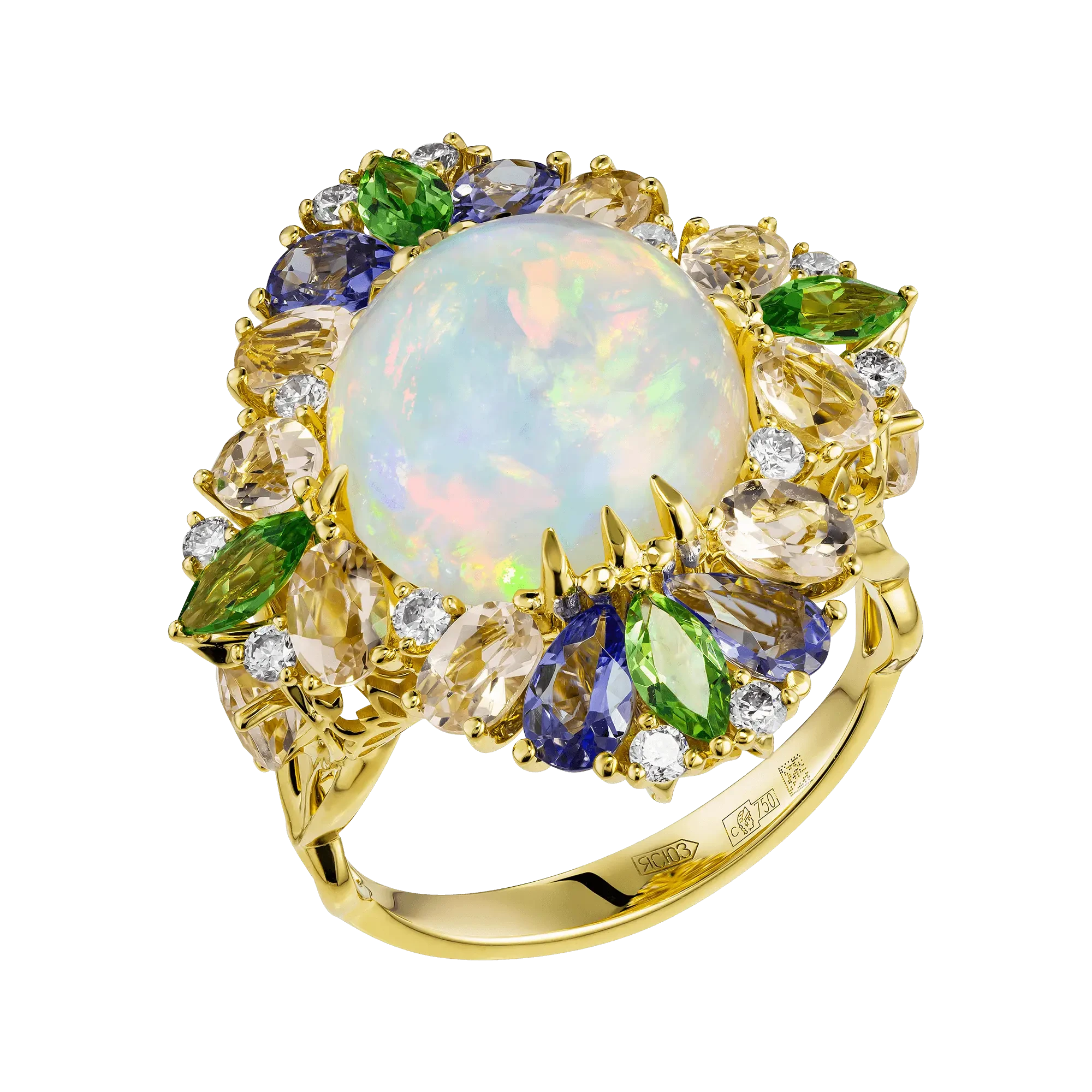 Жёлтое золото объединяет композицию тёплым сиянием, словно солнечный ореол, удерживающий это многоцветие в балансе. Плавные линии оправы подчёркивают природную пластику самоцветов, позволяя свету свободно скользить по их поверхности и усиливать игру оттенков.