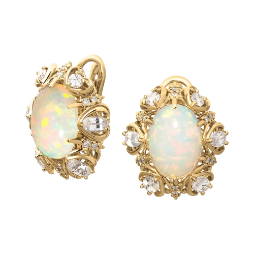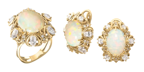 Чтобы авторский гарнитур сверкал особенно красочно, ювелиры украсили его тремя редчайшими опалами, чей молочный оттенок особенно привлекает тех, кто верит в магическую силу драгоценных камней. Ведь именно такие минералы обладают позитивной энергией в неограниченном количестве, отличаясь, таким образом, не только выдающимися характеристиками.