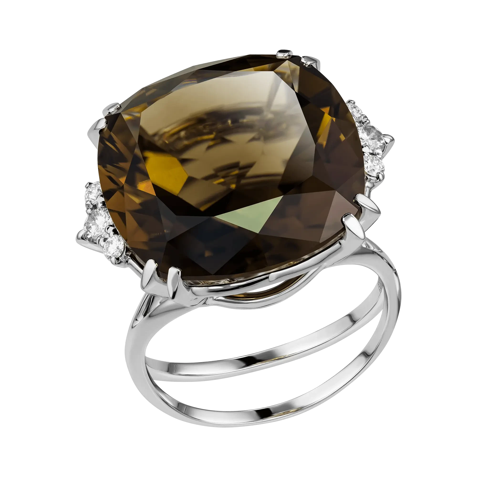 В центре композиции – дымчатые кварцы общим весом 38,72 карата, добытые в бразильском регионе Минас-Жерайс, где природа создаёт минералы с редким золотистым отливом и удивительной глубиной цвета. Их тёплая палитра напоминает о последних лучах солнца, которые задерживаются на горизонте, растворяясь в прозрачном воздухе.