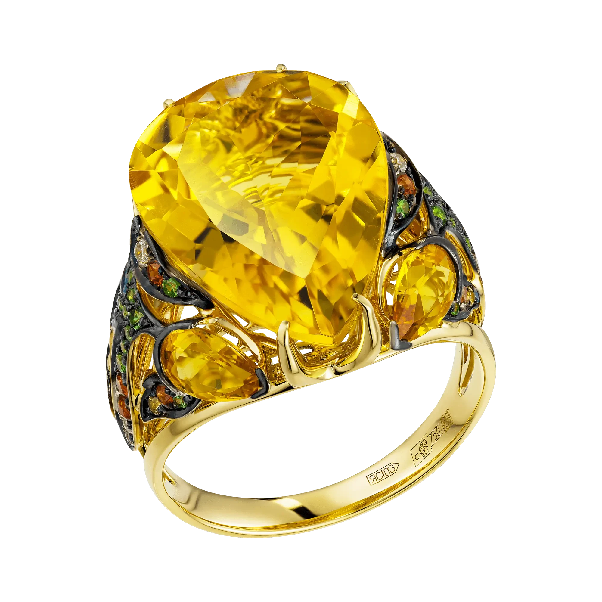 В центре композиции — крупные капли бразильских цитринов, наполненные тёплым, густым сиянием. Их прозрачный золотистый оттенок словно удерживает солнечный свет, создавая ощущение насыщенной, спокойной энергии. Открытая оправа из жёлтого золота подчёркивает природную яркость камней, позволяя им свободно взаимодействовать с движением и светом, раскрывая глубину цвета при каждом жесте.