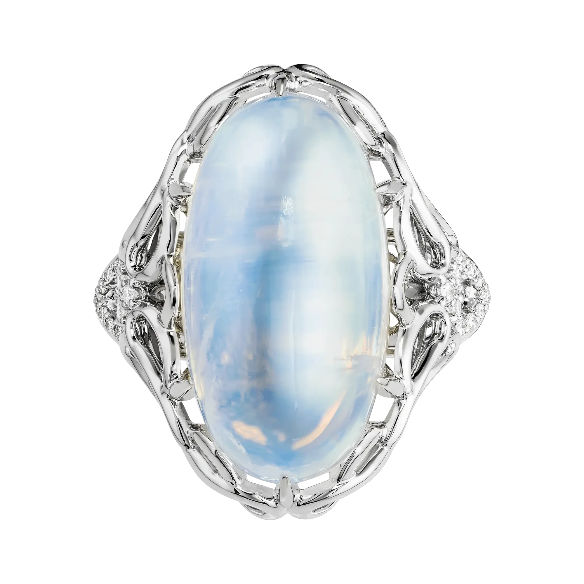 Сложная витиеватая оправа из белого золота образует вокруг самоцвета ажурное обрамление, напоминающее кружево или фантазийный орнамент. Россыпь бриллиантов усиливает ощущение глубины и добавляет холодные световые акценты, подчёркивая таинственную природу лунного камня. В результате кольцо воспринимается как ювелирный образ ночного света — спокойный, загадочный и завораживающий, где форма и металл лишь сопровождают магию природного минерала.