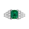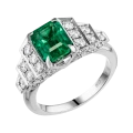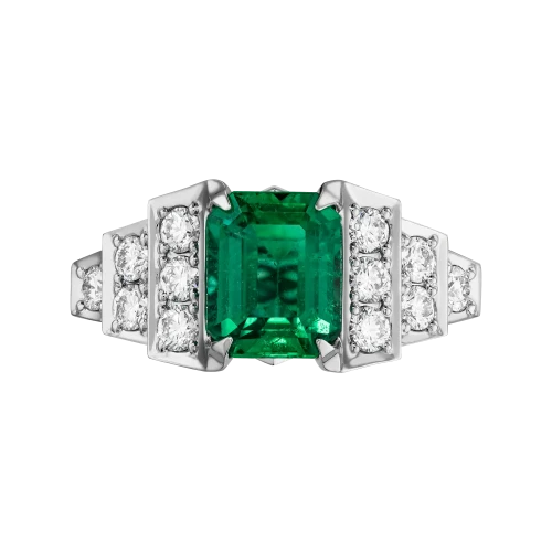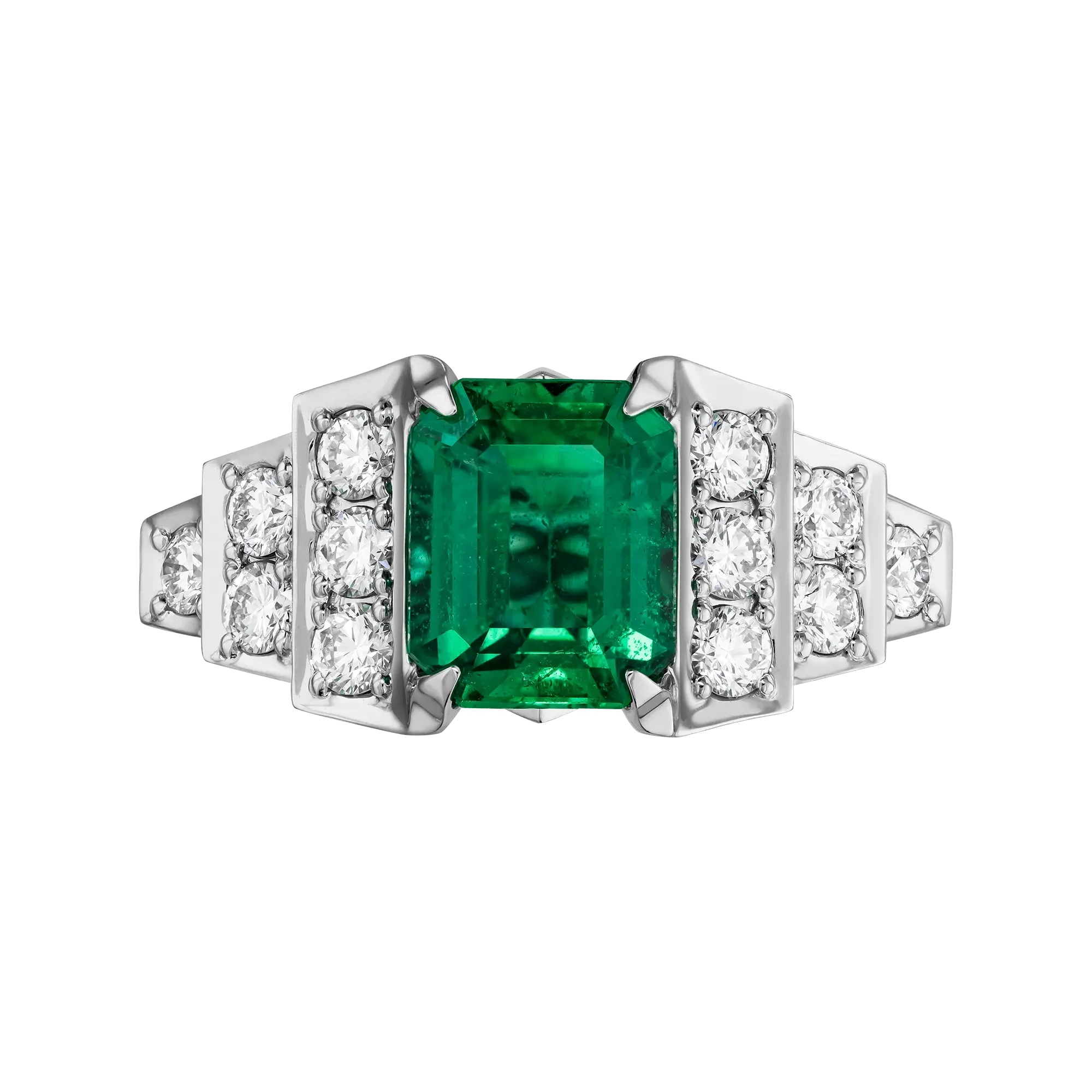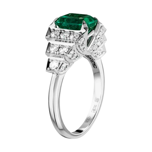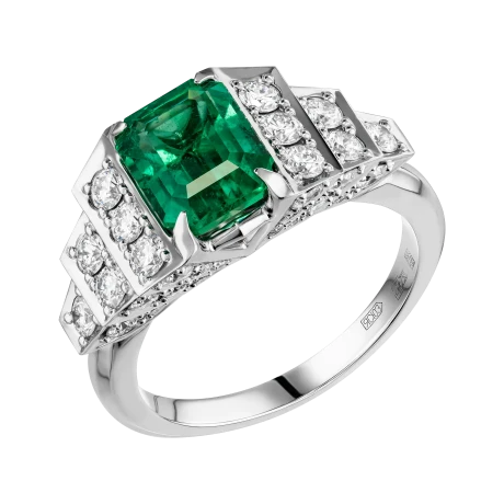В центре кольца сияет уральский изумруд весом 2,07 карата – драгоценный камень удивительной чистоты и насыщенности цвета, напоминающий прохладную глубину воды в чаше фонтана. Его природное происхождение и исключительное качество подтверждены швейцарским сертификатом GFCO GEM LAB. Яркость изумруда поддерживают бриллианты, расположенные по бокам, словно солнечные блики на струях воды.