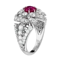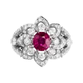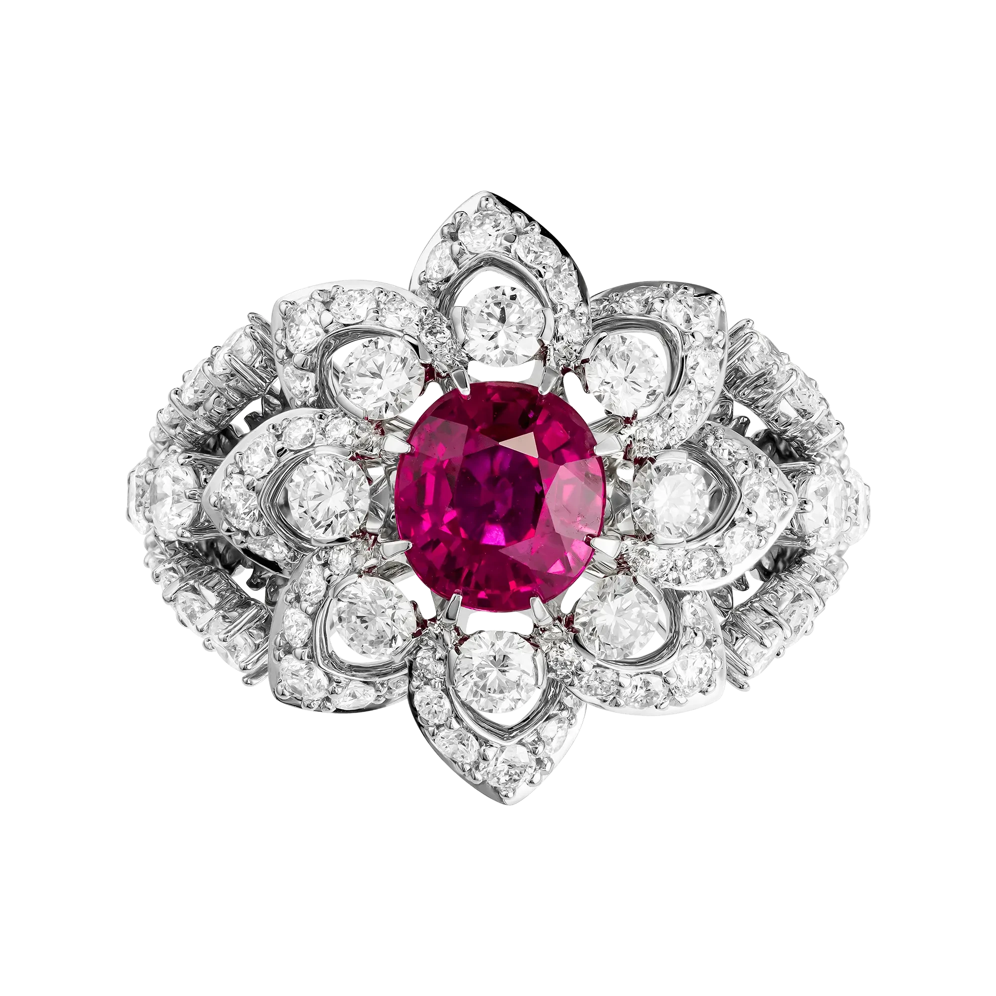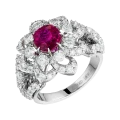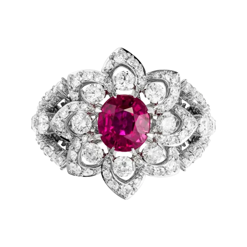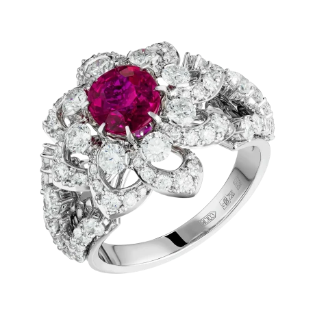 Рубин окружён сложным соцветием из бриллиантов, выстроенным по принципу объёмного светового рельефа. Такое решение усиливает глубину центрального камня и создаёт характерный для барочной эстетики эффект движения и избыточного сияния, где каждый элемент работает на раскрытие эмоциональной силы композиции. Белое золото оправы служит нейтральной архитектурной основой, позволяя цвету и свету доминировать без визуального утяжеления.