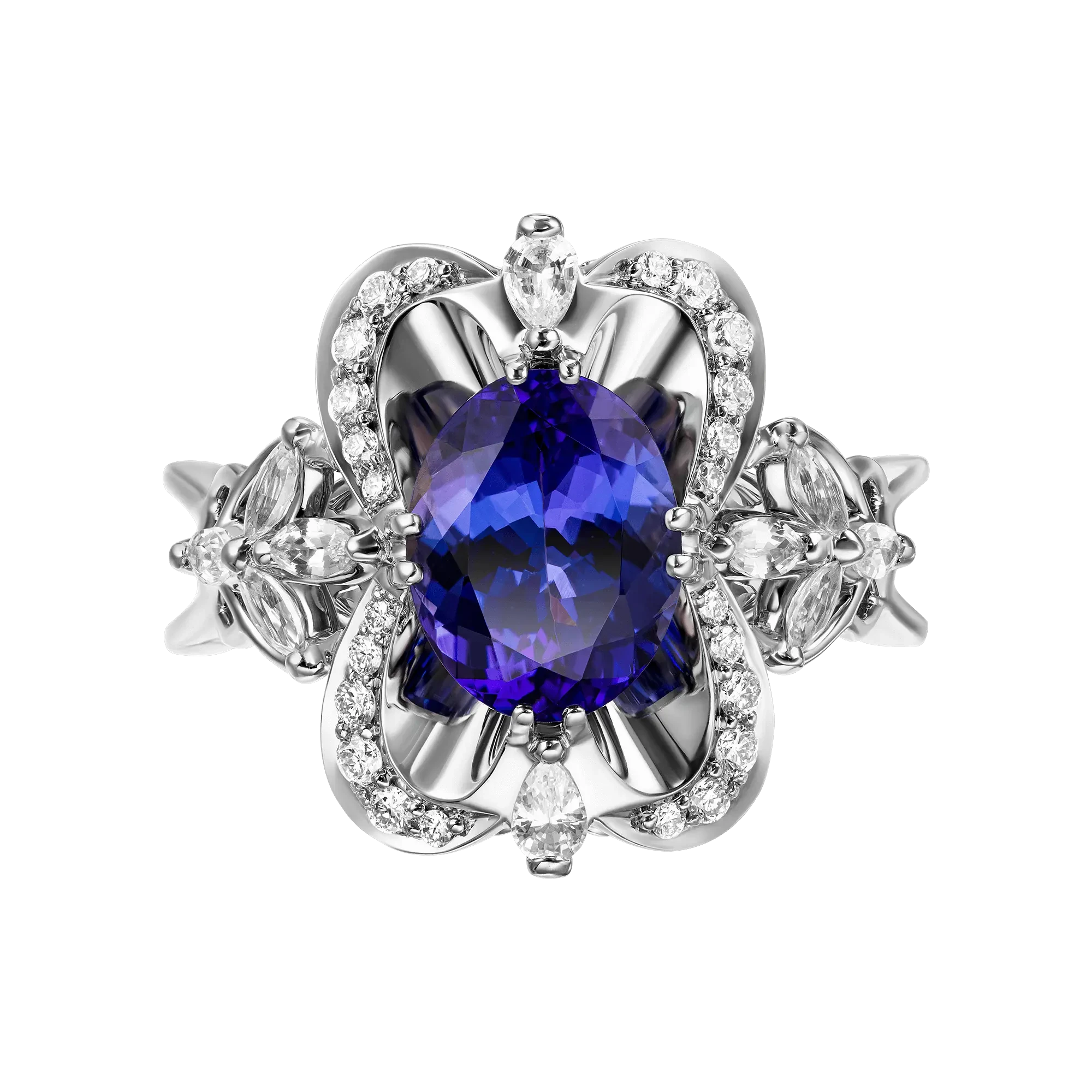 В центре композиции сияет крупный танзанит, заключённый в зеркальную чашу из белого золота. Его насыщенный сине-фиолетовый оттенок переливается бархатными полутонами, будто отражая игру света на парчовых тканях старинных дворцов. Драгоценный камень кажется живым – в его глубине мерцает внутренний огонь, рождающий ощущение движения и эмоционального напряжения.