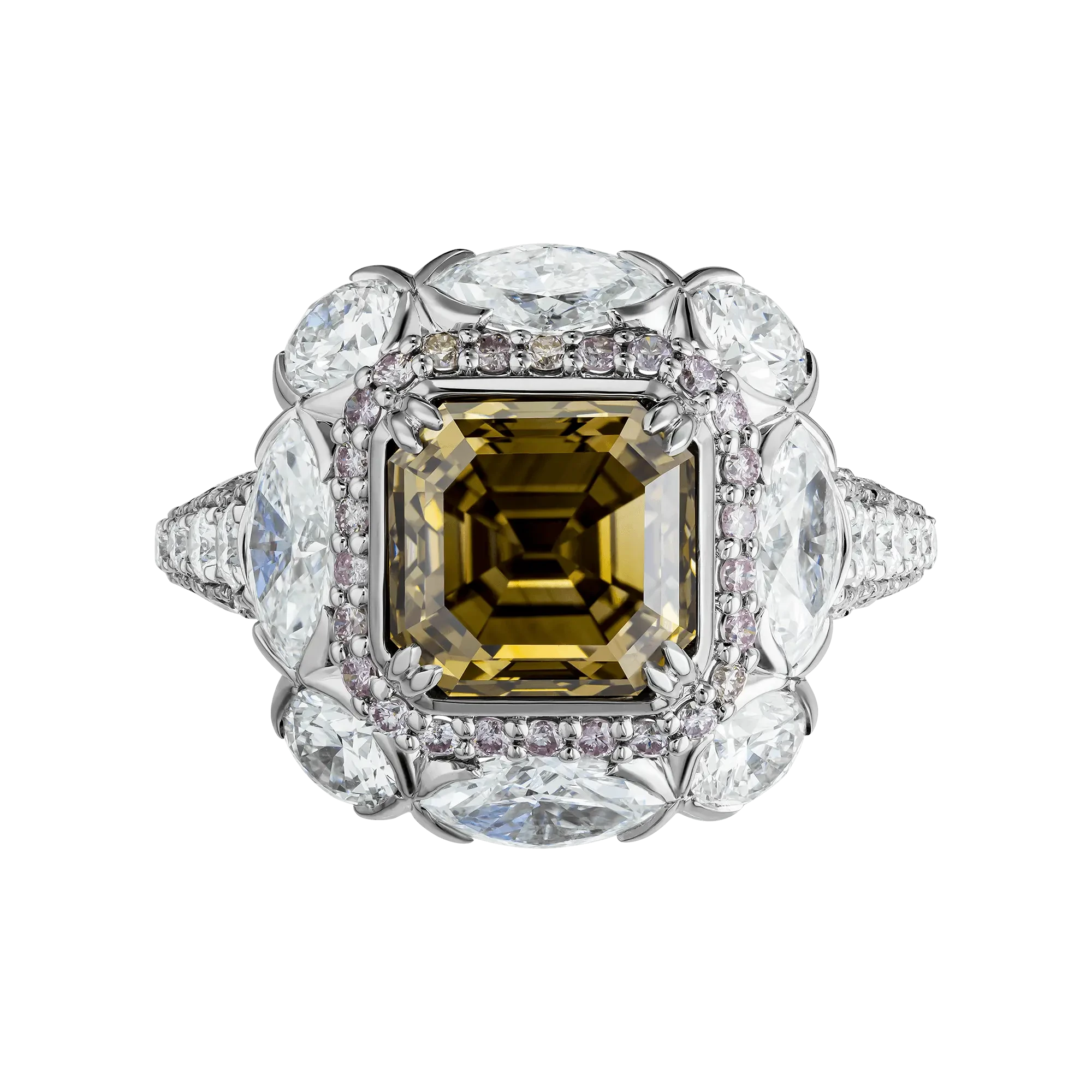 Центральный бриллиант весом 3,51 карата обладает редким оттенком сложной природы — именно такие драгоценные камни высоко ценятся на инвестиционном рынке. Его характер формируется не только размером, но и уникальной цветовой глубиной, которая делает каждый подобный экземпляр индивидуальным и невоспроизводимым.