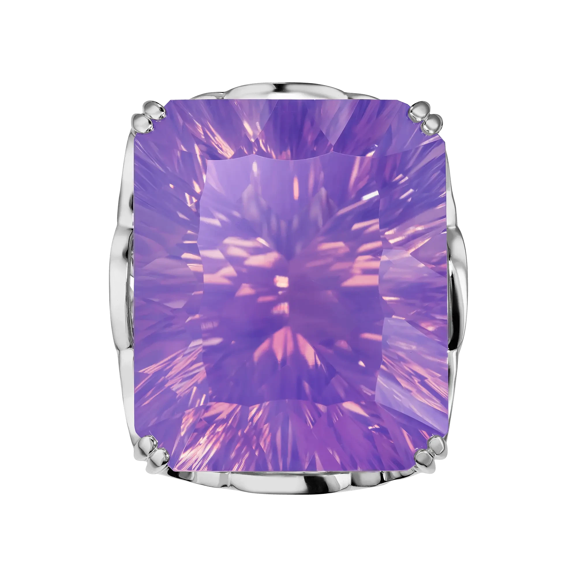 В центре композиции сияет лавандовый аметист весом 34,58 карата – редкий природный камень с мягким переливом света, который словно дышит изнутри. Его полупрозрачное свечение напоминает ранний рассвет, когда небо окрашивается в утончённые сиреневые тона, пробуждая чувства и мысли. Аметисты такого оттенка ценятся не только за красоту, но и за особую энергетику, способную гармонизировать внутренний мир.