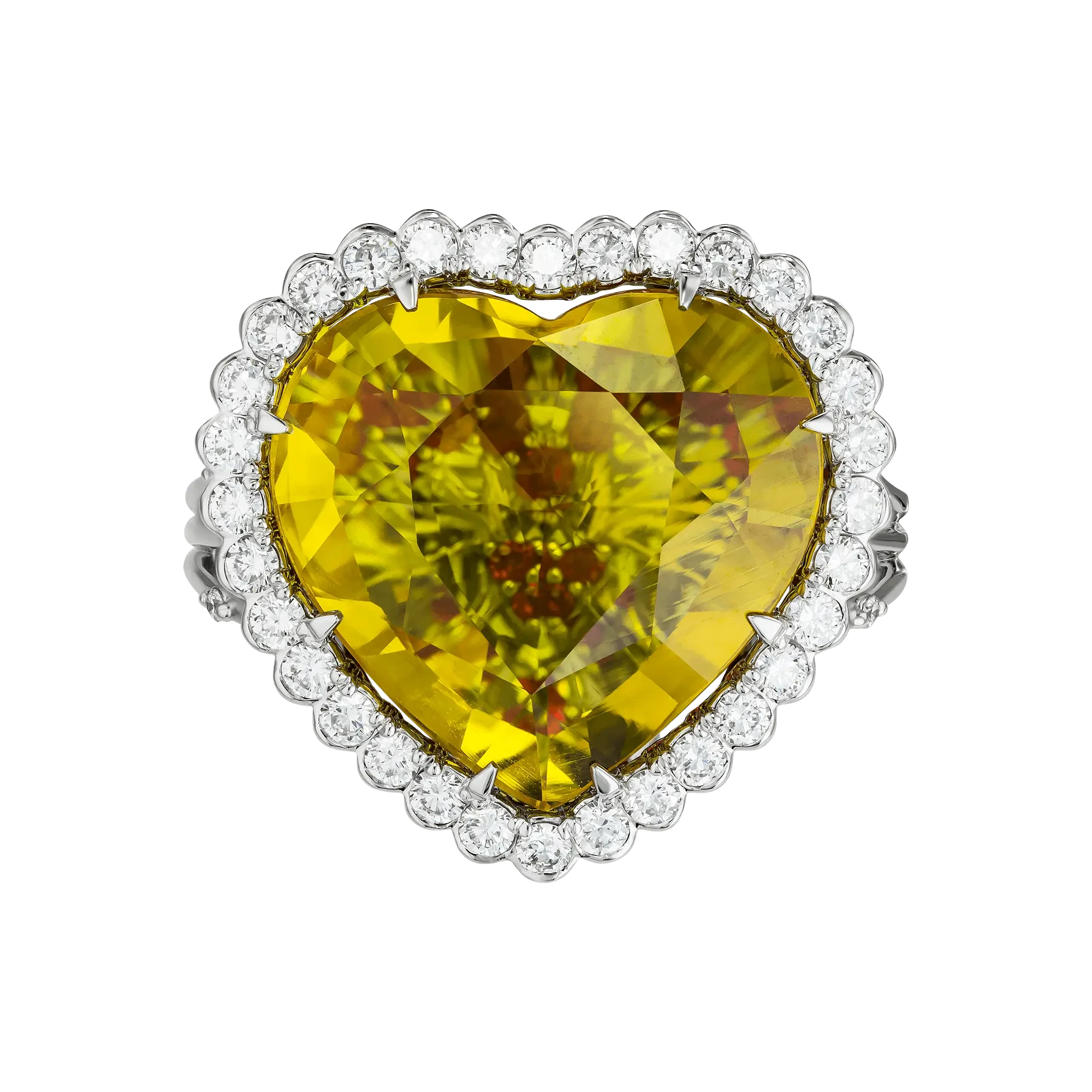 В центре кольца сияет жёлтый сапфир весом 6,42 карат, огранённый в форму сердца — одну из самых сложных и требовательных к качеству камня. Такая огранка раскрывает не только глубину цвета, но и подчёркивает симметрию, чистоту и внутреннюю прозрачность минерала. Насыщенный солнечный оттенок свидетельствует о высокой природной концентрации цвета, а подтверждение его происхождения международным сертификатом GFCO GEM LAB (Швейцария) гарантирует подлинность и исключительные геммологические характеристики.