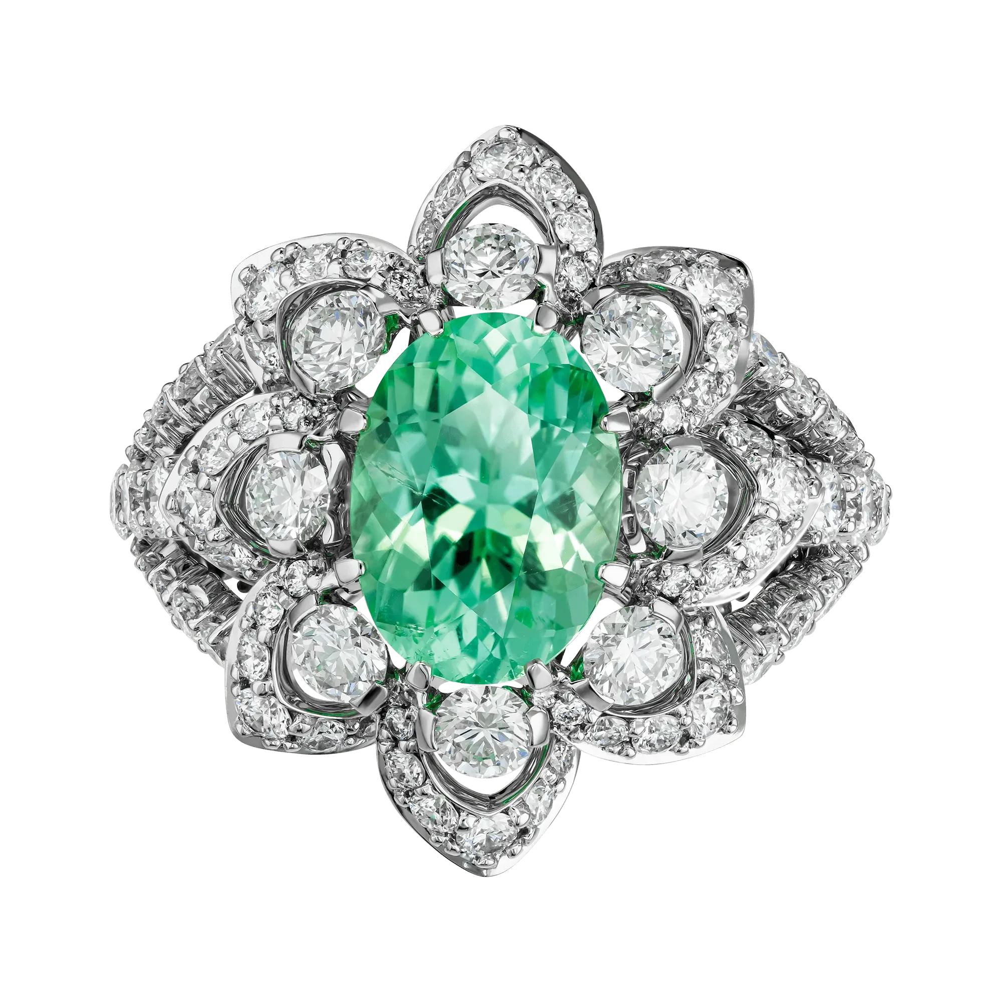 В центре композиции – редчайший турмалин Параиба из Мозамбика весом 2,90 карата. Драгоценные камни такого качества принадлежат к числу наиболее востребованных в мире – их добыча крайне ограничена, а уникальная окраска обусловлена присутствием меди и марганца, создающих эффект живого люминесцентного свечения. Оправа из белого золота, полностью выложенная бриллиантами, подчеркивает уникальный цвет Параибы, превращая кольцо в классическое произведение, достойное семейной коллекции.