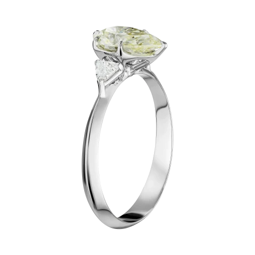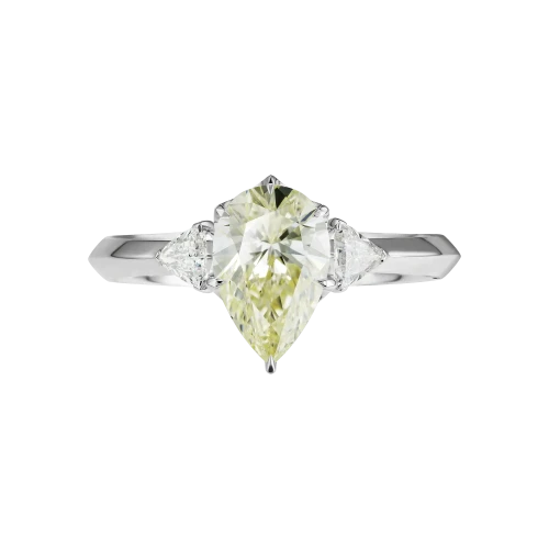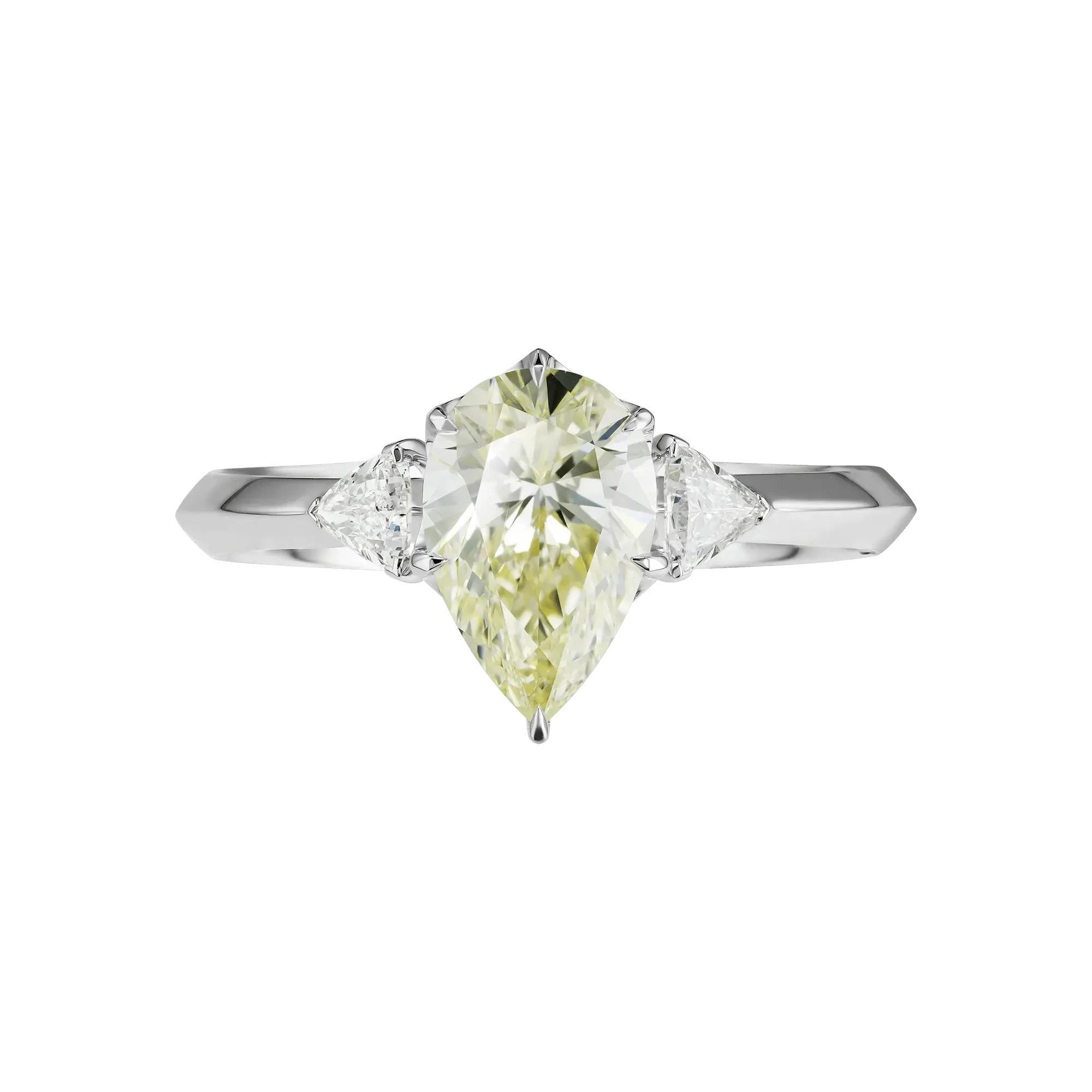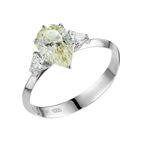 В лаконичном кольце мастера Maxim Demidov отдали центральное место бриллианту каплевидной огранки весом 1,064 карата с тонким лимонным оттенком. Его цвет воспринимается сдержанно и интеллектуально: он не стремится к эффектности, а раскрывается через глубину и чистоту светового потока, задавая всей композиции спокойный и уверенный вектор.
