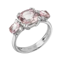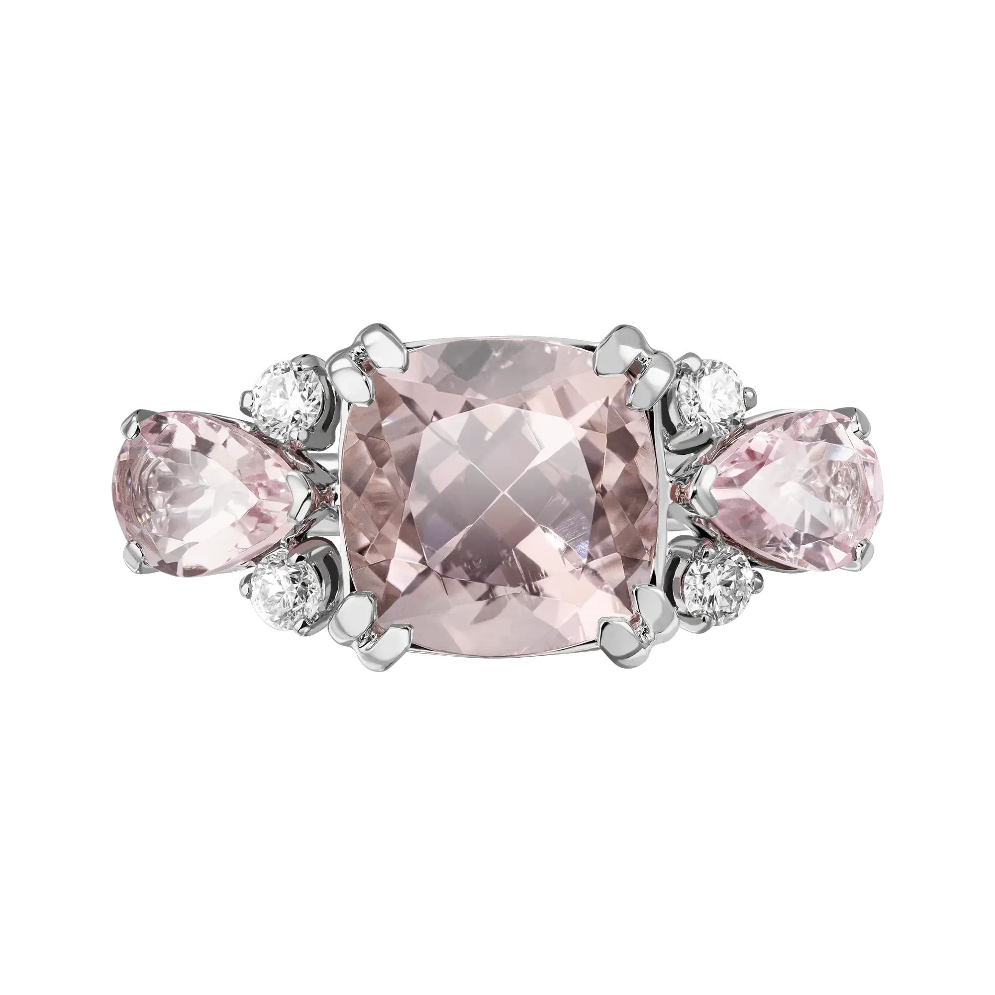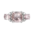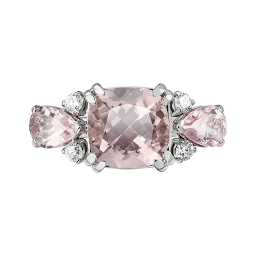 Главным «ароматом» украшения, по-весеннему приятным и напоминающим о цветении сакуры, стали три чистейших морганита. Закрепленное в лаконичную оправу из белого золота таким образом, чтобы можно насладиться  достоинствами пудровых самоцветов со всех сторон, центральное трио элегантно, без кричащего вызова, контрастирует бриллиантами, демонстрируя в этой гармонии единую прозрачность.