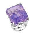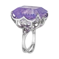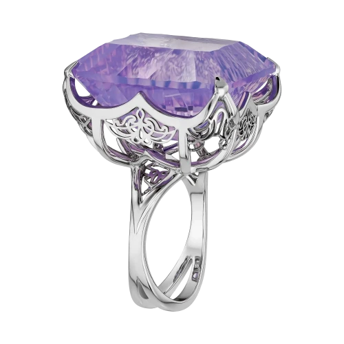 В кольце «Эфира кружево» лавандовый аметист раскрывается как материя света — полупрозрачная, текучая, наполненная внутренним дыханием. Крупный камень словно удерживает в себе тишину и прохладу оттенка, где цвет проявляется мягко и многослойно, создавая ощущение глубины без тяжести и давления формы.