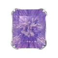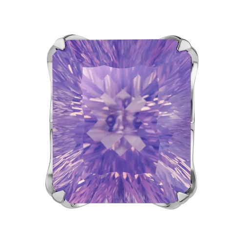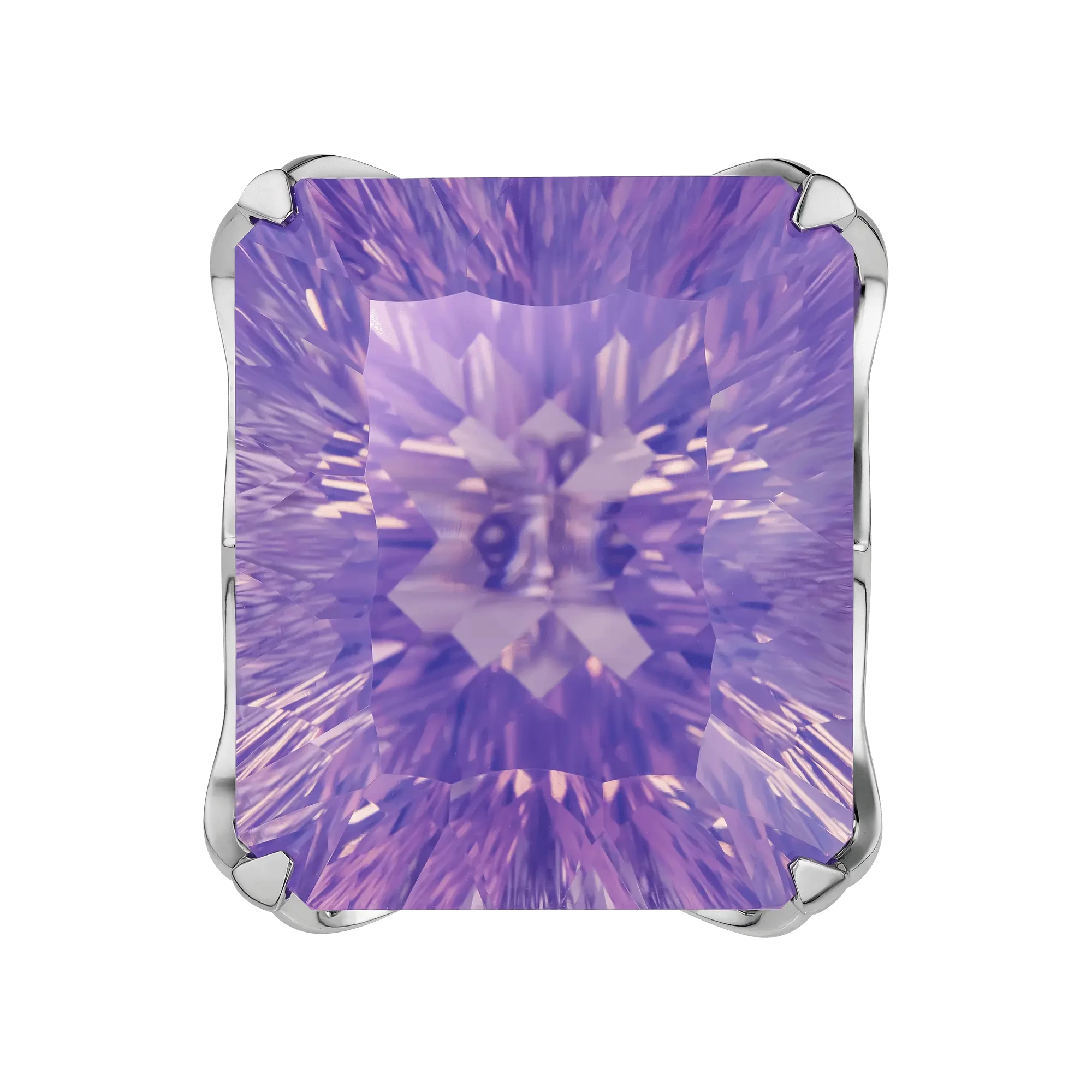 Необычная огранка позволяет увидеть сквозь аметист тончайшие линии оправы, выполненные из белого золота. Они проступают как изящное кружево, вплетённое в саму структуру природного камня, — не как декор, а как продолжение его внутреннего рисунка. Свет проходит через грани, встречает металл и возвращается обратно, усиливая ощущение эфирности и пространственного объёма.