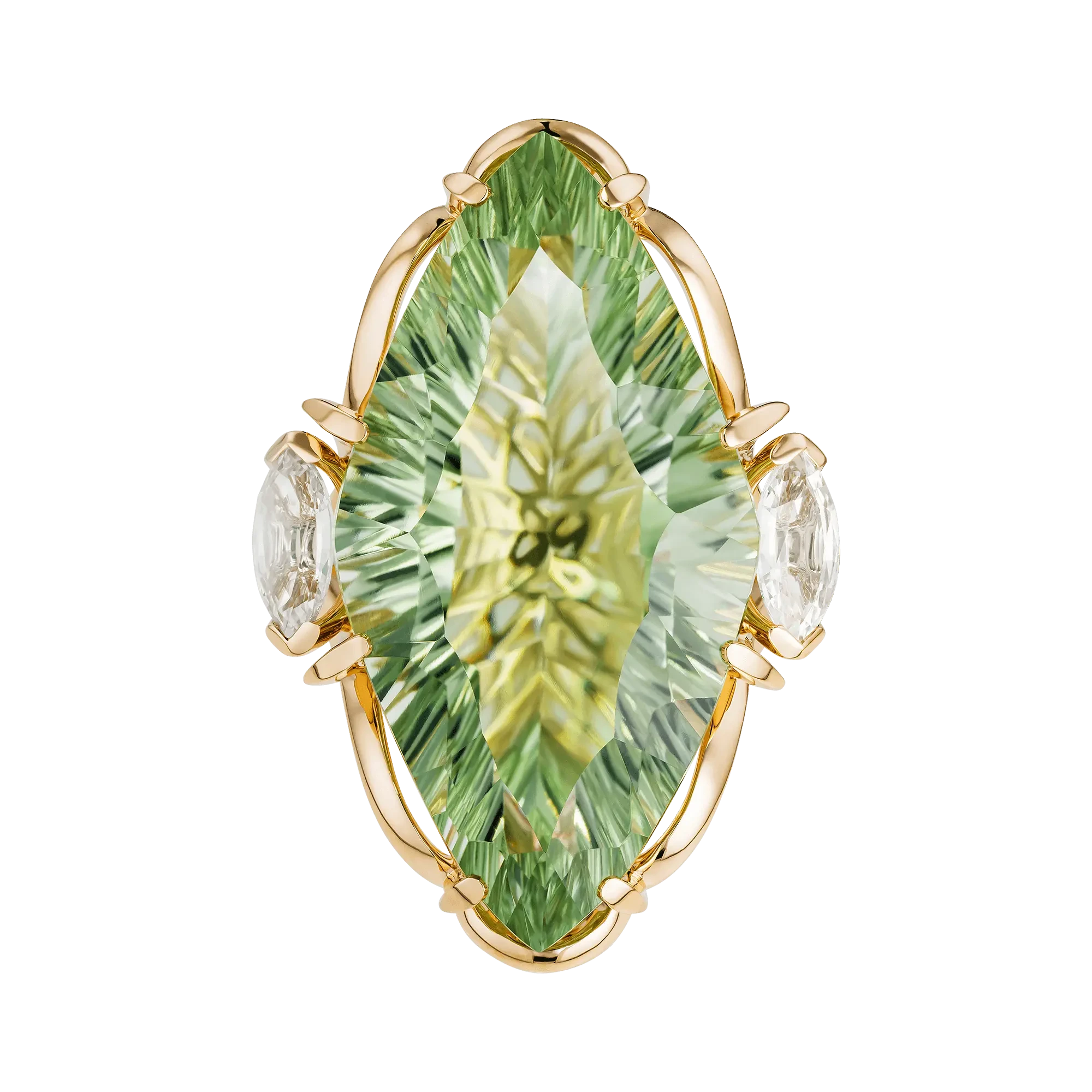 Два белых сапфира по сторонам от центрального самоцвета выступают тонкими акцентами — чистыми, как отблески росы на лепестках. Их прохладное мерцание подчёркивает деликатность зеленого кварца, усиливая ощущение прозрачности и баланса.