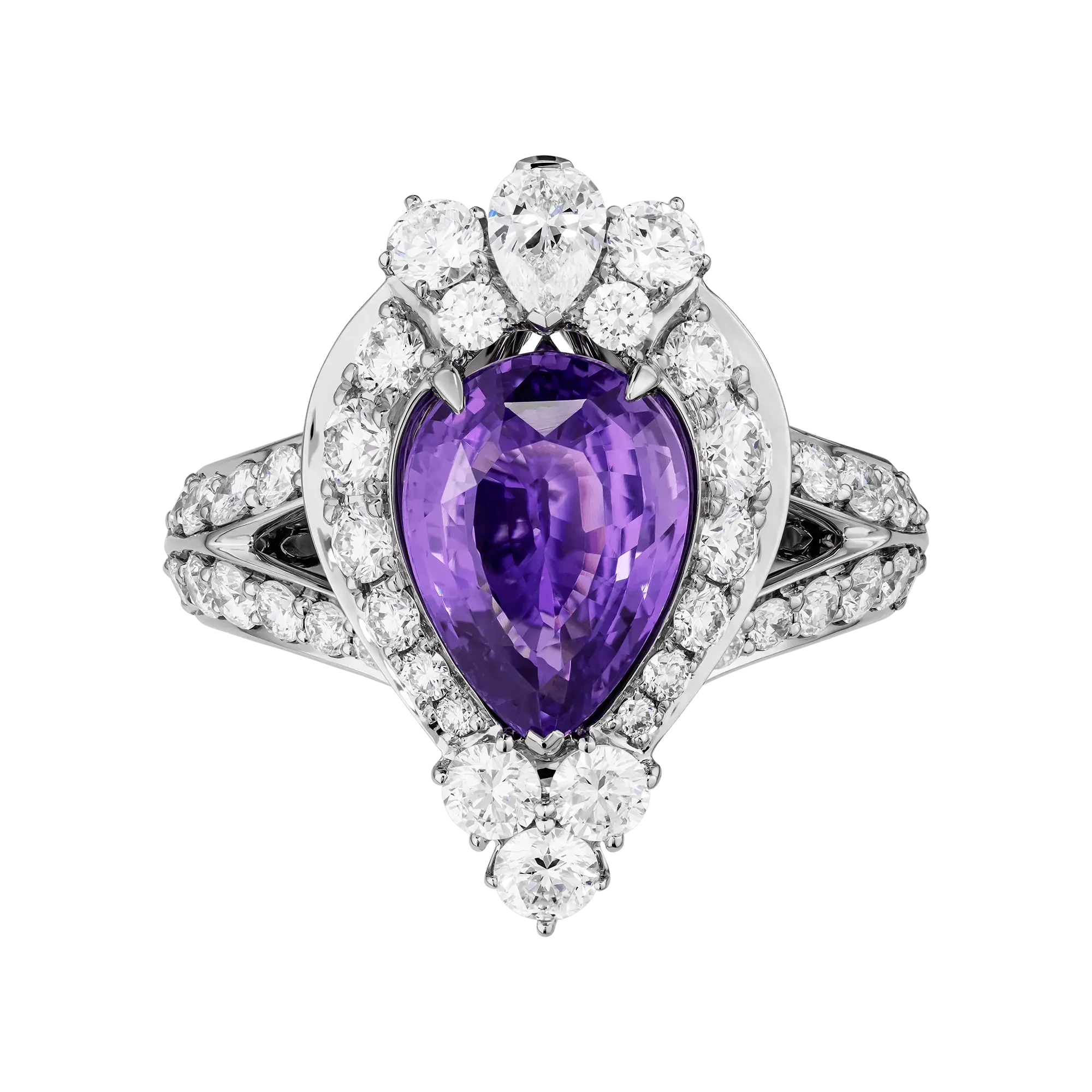 Белое золото оправы служит чистым пространством, где сияние цветного сапфира раскрывается в полной мере. Россыпь бриллиантов усиливает звучание композиции, создавая игру света, не нарушающую целостность восприятия, а лишь подчеркивающую её тонкость. Гармония линий и пропорций создаёт эффект глубокой тишины, наполненной смыслом.