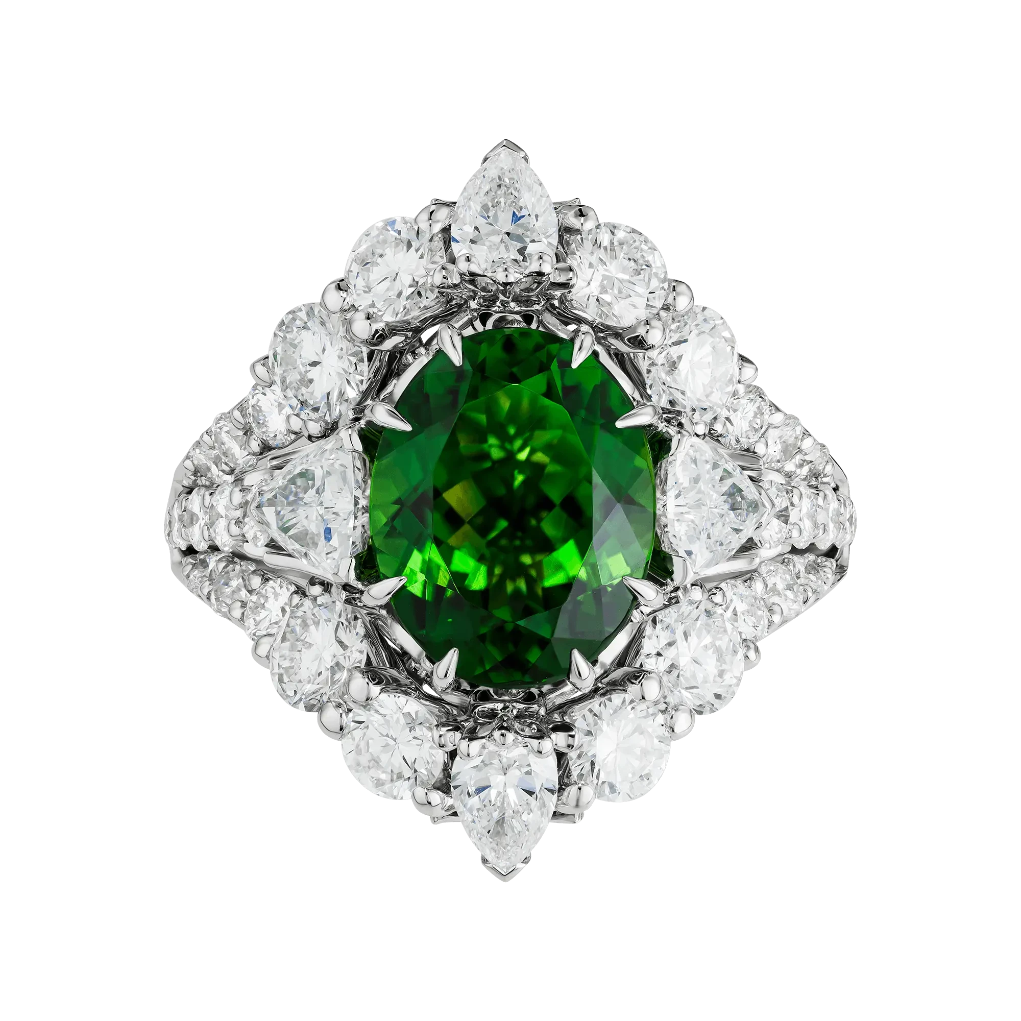 В центре — яркий хромтурмалин весом 3,24 карата, добытый в Танзании. Этот минерал ценится за интенсивный природный зелёный цвет, обусловленный присутствием хрома в кристаллической структуре. В отличие от классических зелёных турмалинов, хромтурмалин обладает более глубокой и насыщенной тональностью, близкой к оттенкам высококачественных изумрудов, но при этом сохраняет собственную характерную прозрачность и живую игру света. Камень демонстрирует высокую чистоту и выразительную световую отдачу, что делает его центральным элементом композиции не только визуально, но и с точки зрения геммологической ценности.