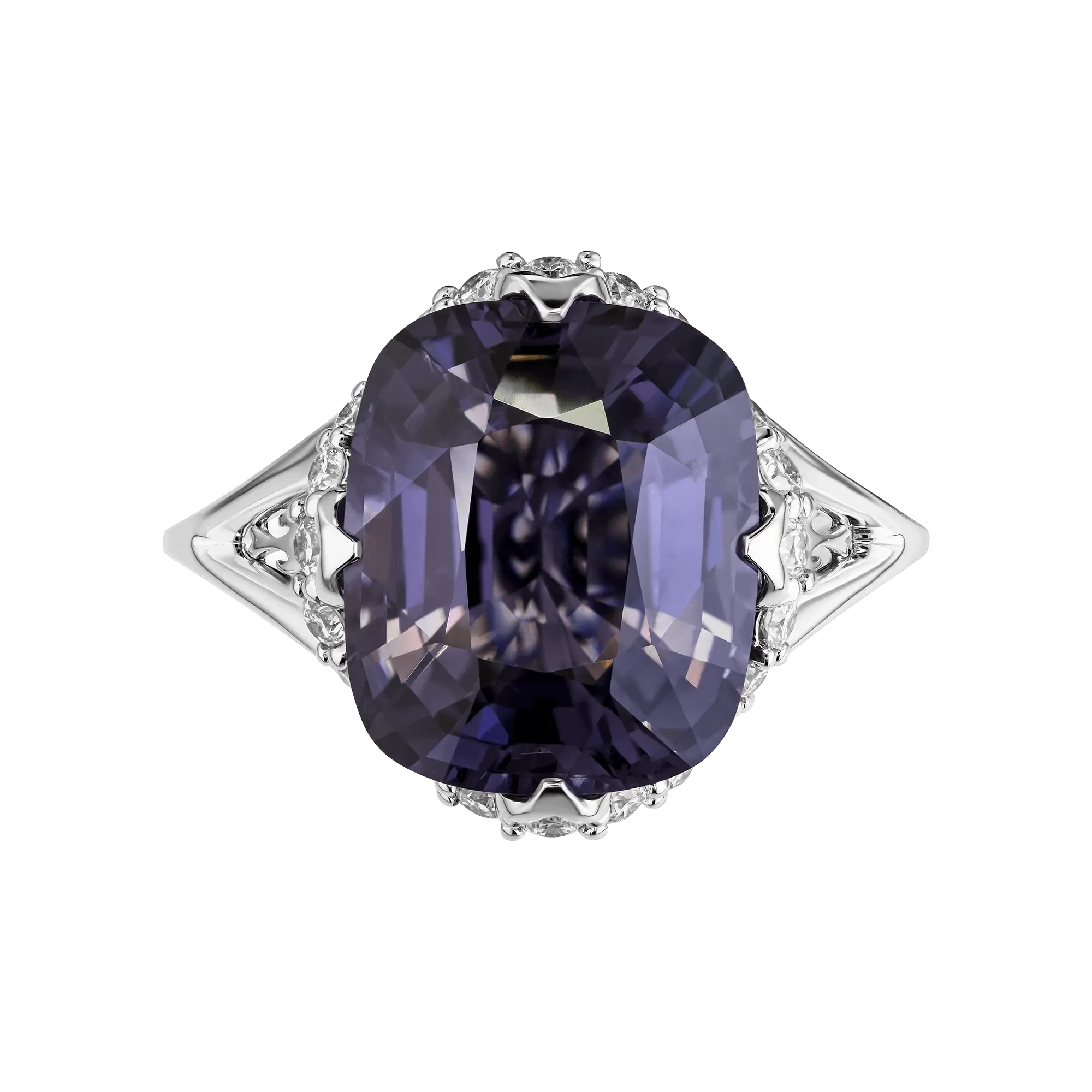 В центре композиции сияет благородная шпинель весом 7,05 карата – природный камень, чья окраска напоминает небо перед дождём. Под разными углами он раскрывает то холодный отблеск лилово-серых облаков, то мягкое свечение вечернего неба. В его глубине чувствуется тишина, наполненная дыханием грядущего шторма.