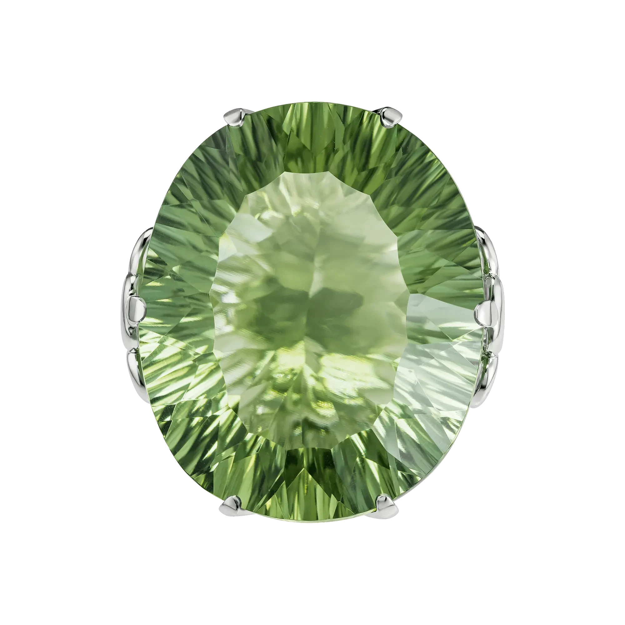 В центре композиции — крупный празиолит, разновидность кварца, ценимая за чистоту кристалла и мягкий зелёный оттенок с холодным мятным подтоном. Камни высокого качества отличаются равномерным цветом и высокой прозрачностью, позволяющей свету проходить сквозь грани свободно и глубоко. Благодаря особой огранке празиолит в этом кольце демонстрирует лучистую игру, создавая эффект внутреннего сияния без резких контрастов.