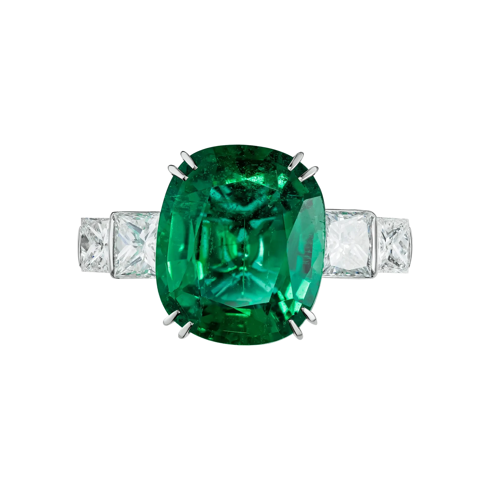 В центре композиции — изумруд из Замбии весом 4,17 карата, отличающийся ярким, насыщенным зелёным оттенком и высокой степенью прозрачности. Такой цвет ценится экспертами за живую глубину и природную энергию, которую невозможно воспроизвести искусственно. Изумруд не доминирует внешним эффектом — он притягивает взгляд постепенно, раскрываясь вблизи, что напрямую перекликается с идеей названия.