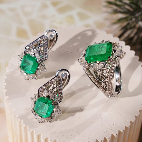 Элегантные завитушки бриллиантового узора обволакивают прозрачным сиянием чистейший изумруд из Колумбии. Яркий огонь камня весом 5,48 карат горит как истинный символ любви, над которой не властно время.