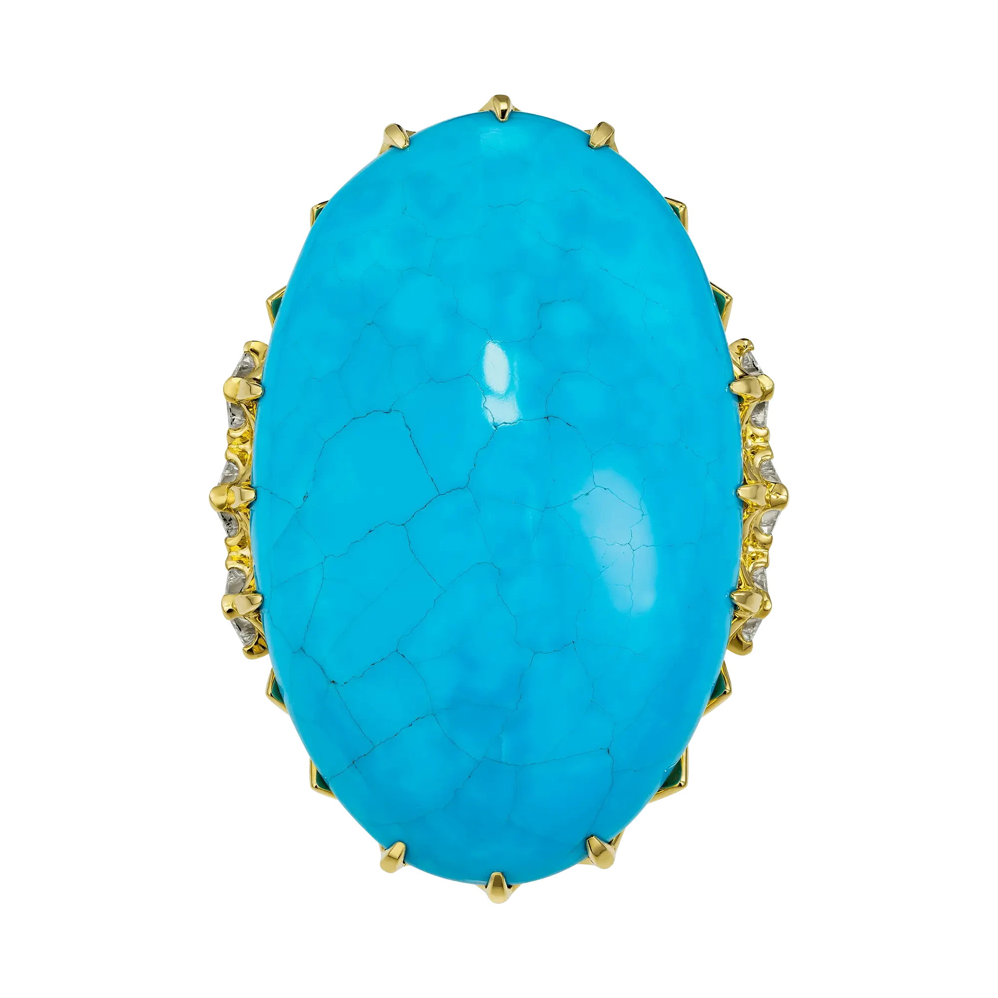 Величественная бирюза из Аризоны весом 44,56 карата стала центром авторского кольца, в котором природа словно оставила свой след – хрупкий узор прожилок, похожий на карту ветров, прочерченную на небесной глади. Этот редкий камень, известный своей неповторимой структурой и насыщенным небесно-голубым оттенком, ценится во всём мире за чистоту тона и природную игру линий, создаваемую самой землёй.