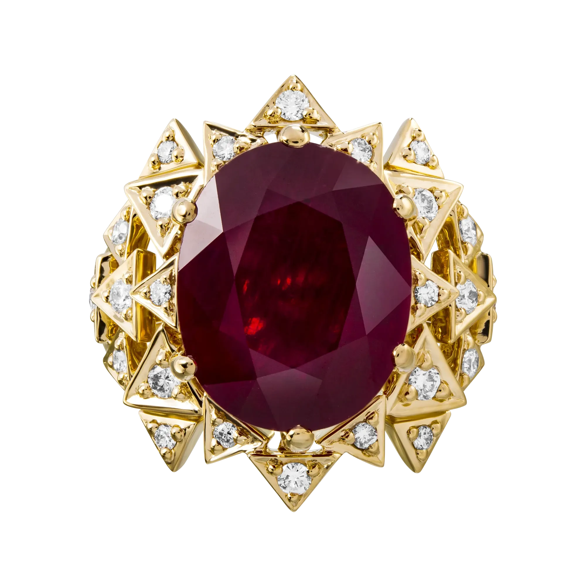 Крупный, весом 13,99 карата, корунд родом из Мозамбика завораживает игрой сочных багряно-пурпурных оттенков, буквально иллюстрируя природную магию – со времен Олимпийских богов рубин считается символом любви, энергии и власти.