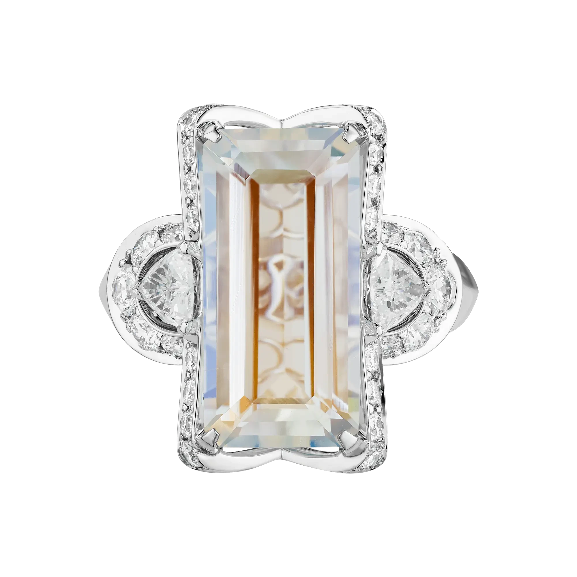 Оправа из белого золота создана как лёгкая архитектурная конструкция: плавные линии и ажурные элементы формируют пространство, в котором самоцвет будто парит. Бриллианты, расположенные по контуру, добавляют тонкие акценты — не конкурируя с центральным камнем, а поддерживая его нежное сияние, придавая композиции глубину и визуальную прозрачность.