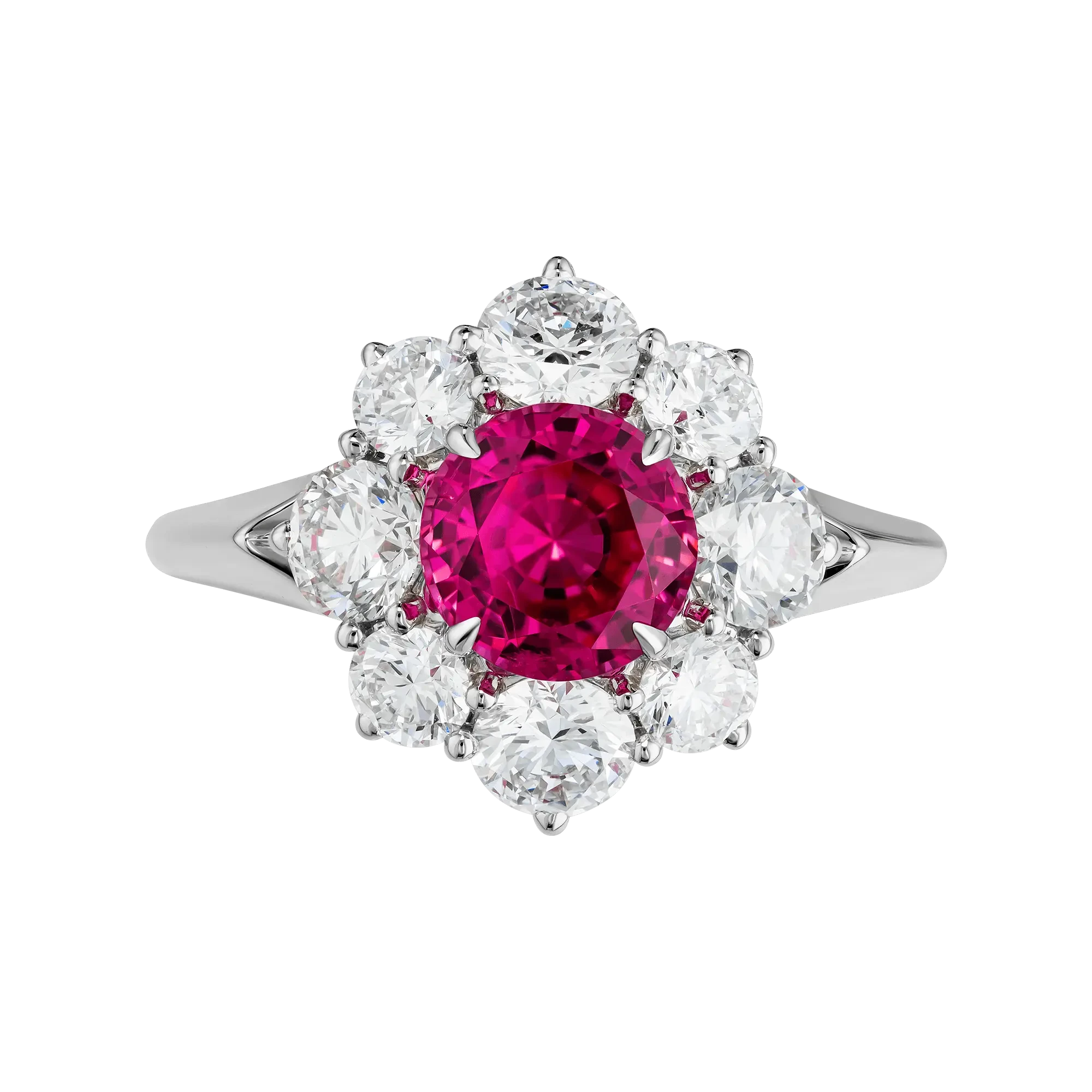 Мастера окружили шпинель выразительным ореолом крупных бриллиантов, усиливающих насыщенность центрального камня и создающих эффект сияющей вспышки света. Лаконичная оправа из белого золота подчёркивает чистоту линий и делает композицию визуально лёгкой, позволяя главному самоцвету раскрыть всю глубину своего редкого оттенка.