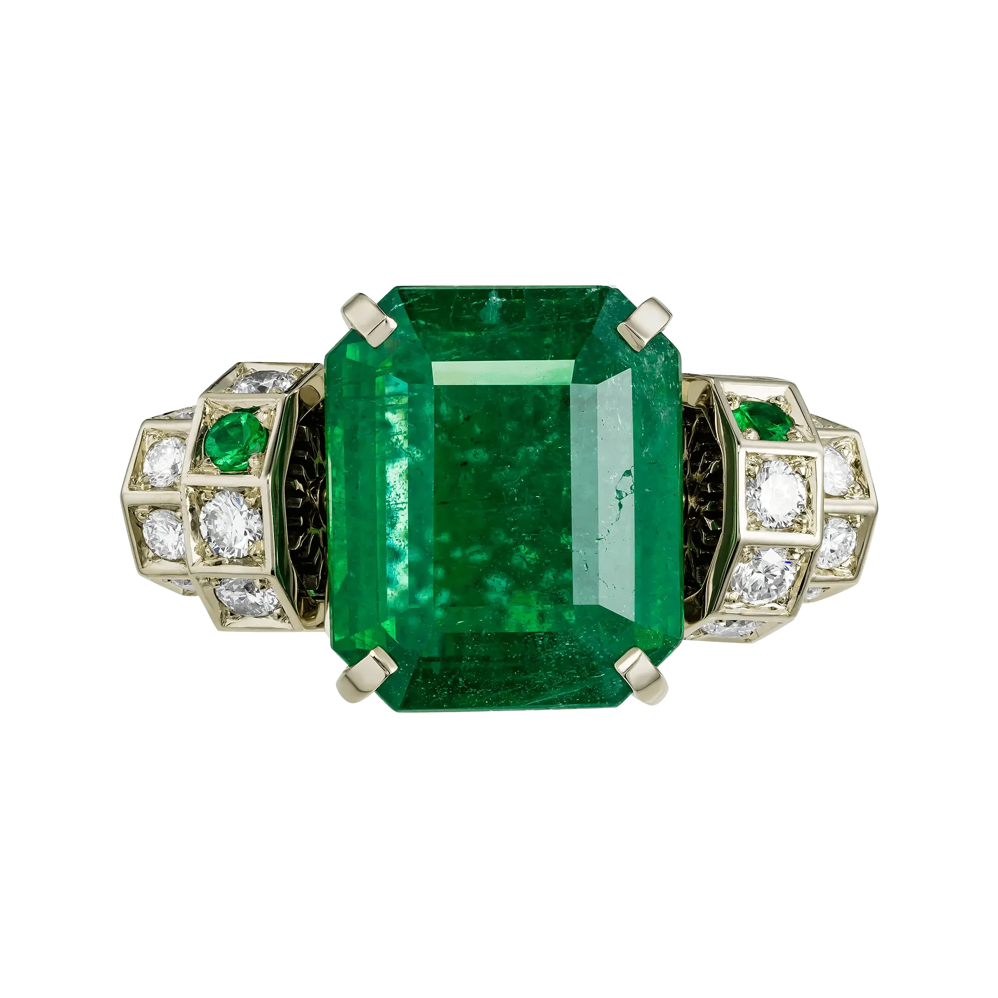 В сердце композиции — замбийский изумруд весом 7,82 карата, самоцвет, издавна связанный с темами прозрения, гармонии и внутреннего знания. Его насыщенный зелёный цвет воспринимается как концентрированная энергия жизни — спокойная и уверенная. Изумруд заключён в подвижную конструкцию: два элемента оправы, инкрустированные бриллиантами, мягко вращаются вокруг оси, создавая ощущение непрерывного движения и поиска.