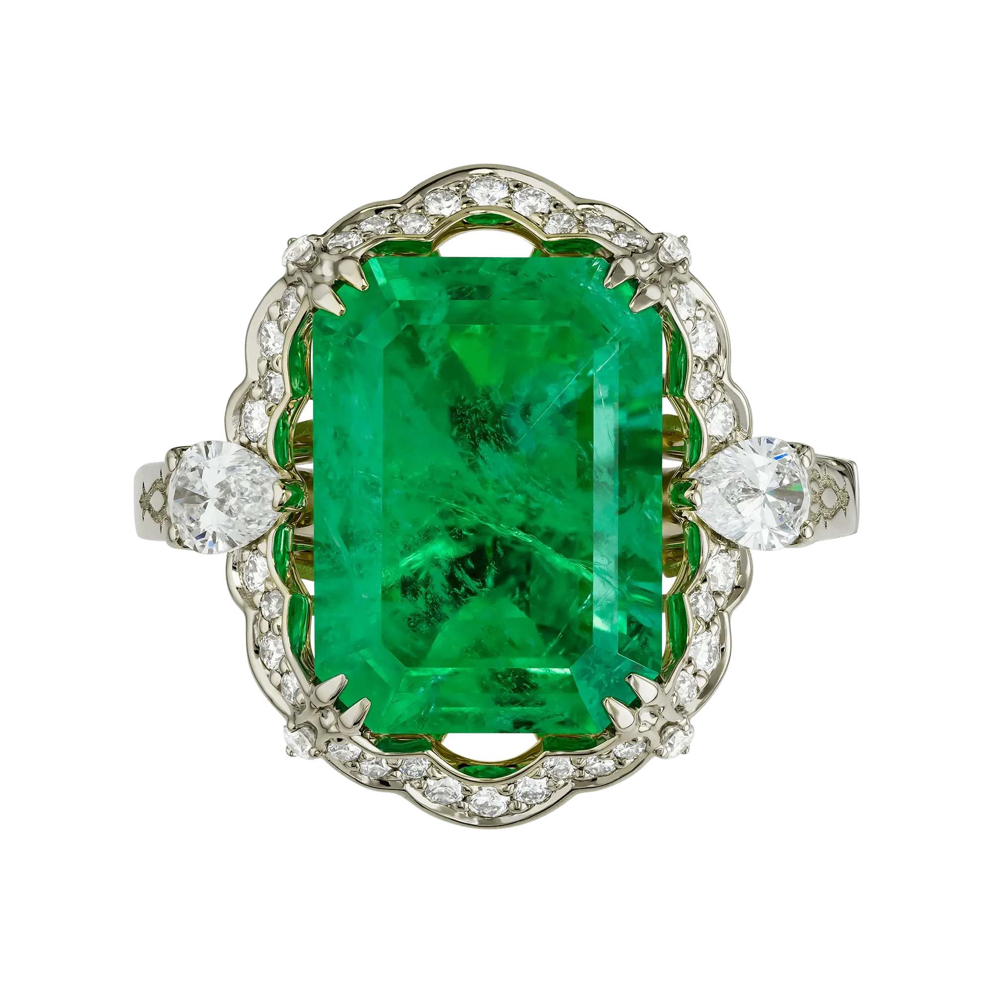 Выразительный самоцвет обрамлён сложной композицией из бриллиантов различных огранок, чьи искристые вспышки усиливают глубину зелёного цвета. Контраст жёлтого и белого золота подчёркивает архитектуру украшения и придаёт композиции особую объёмность, словно свет мягко скользит по граням драгоценных камней.