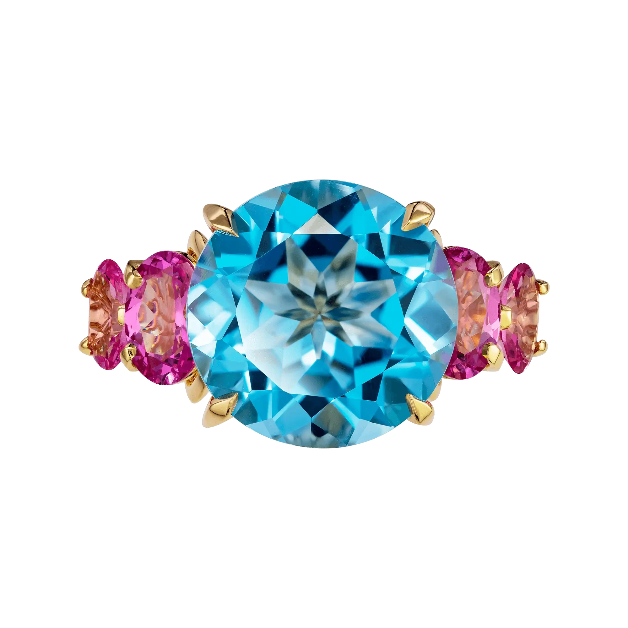 В центре – небесный топаз, прозрачный, как взгляд, в котором нет ни тени сомнения. Его круглая огранка делает свет почти живым – он струится сквозь грани, как мягкое течение воды. С двух сторон топаз обрамлён шпинелью ягодного оттенка – чуть приглушённого, бархатистого, как полутон в голосе. Это не контраст, а диалог: между свежестью и теплом, прозрачностью и глубиной.