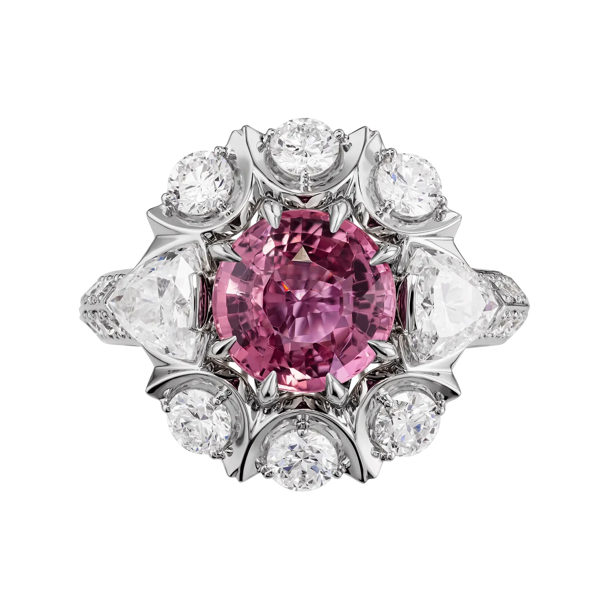 В центре композиции — пурпурно-розовый сапфир весом 2,74 карата, добытый на Мадагаскаре, где природа одаряет камни особой игрой света и глубиной цвета. Его оттенок – сложный и многослойный, как аромат жасмина на вечернем ветру: в нём соединяются прохлада рассвета, тепло заката и едва ощутимая чувственность мгновения. Оправа из белого золота, усыпанная бриллиантами, раскрывается, словно цветок, встречающий первые лучи солнца, позволяя свету мягко играть на каждой грани.