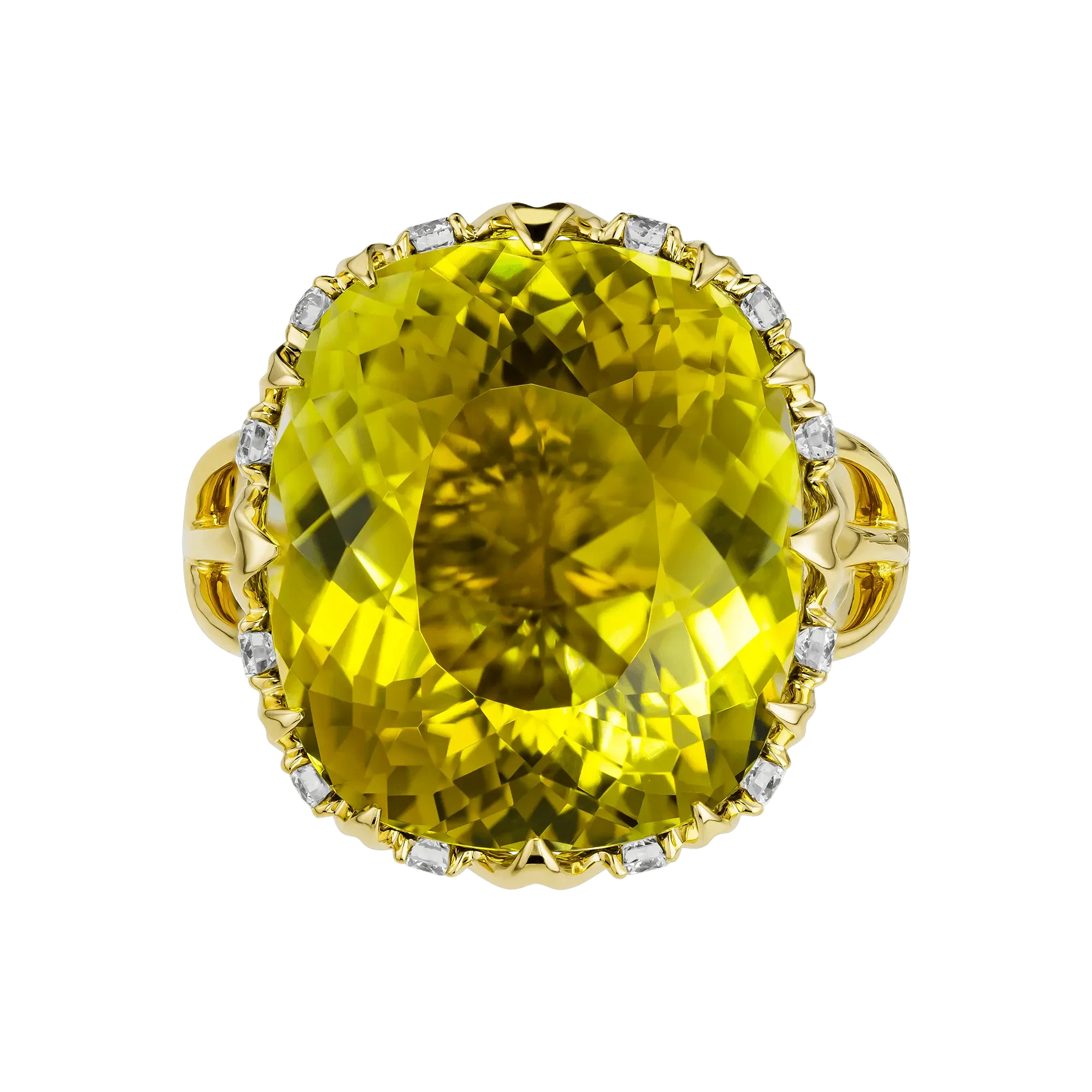 Украшение «Обручение со светом» рождается в тот самый момент, когда взгляд встречается с канареечным турмалином и сразу понимает: перед ним не просто драгоценный камень, а живое сияние, обретшее форму. Самоцвет из Конго весом 18,30 карата обладает редким оттенком — насыщенным, тёплым, почти солнечным, где жёлтый звучит глубоко и многослойно, без резкости, словно наполненный внутренним светом.