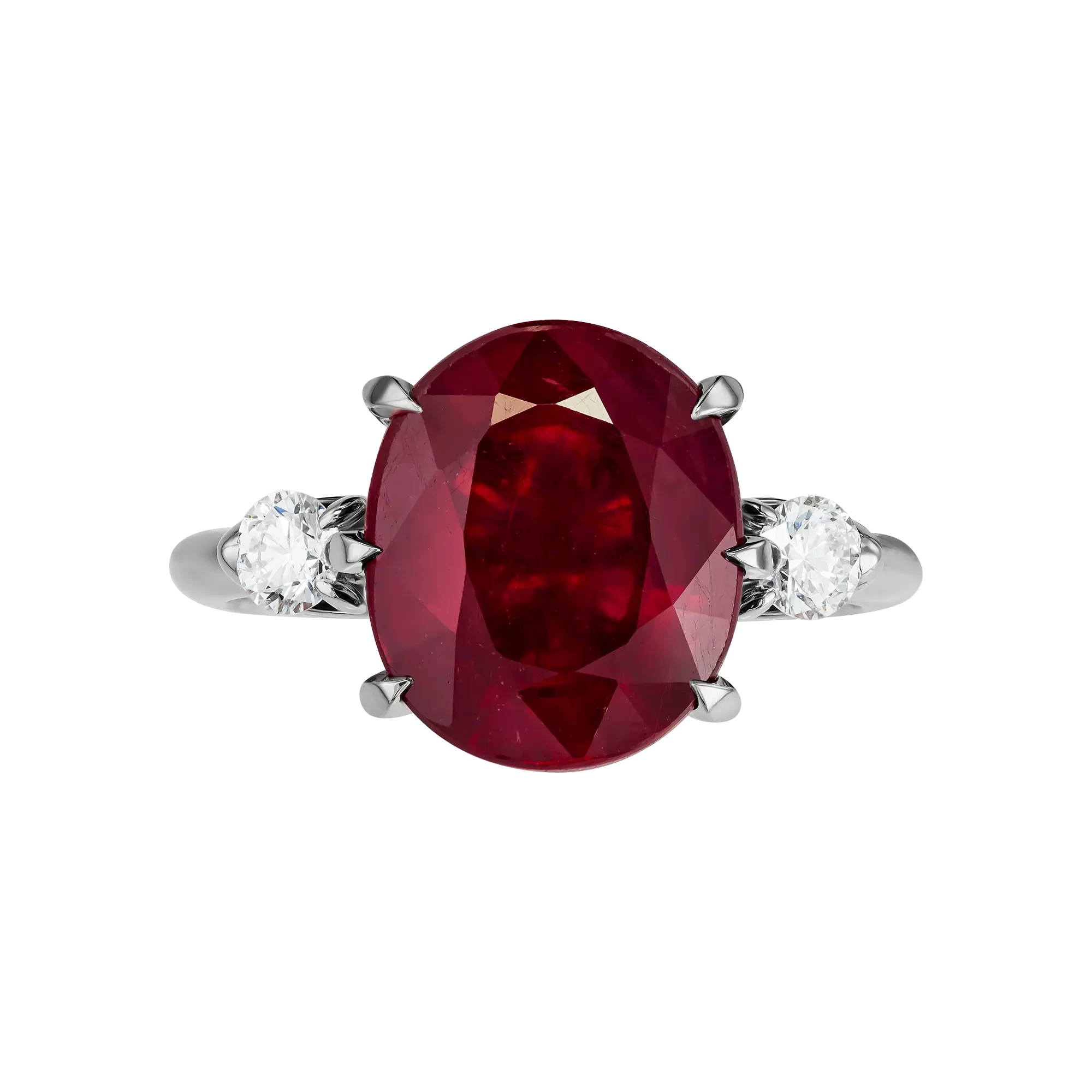 Оправа из благородной платины выстроена с подчёркнутой сдержанностью и точностью. Холодный металл создаёт выразительный контраст с горячей природой рубина, усиливая ощущение, будто огонь намеренно заключён в строгую форму. Бриллианты добавляют чёткие световые акценты, подчёркивая объём самоцвета и усиливая его глубину, не нарушая общей строгости образа.