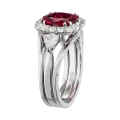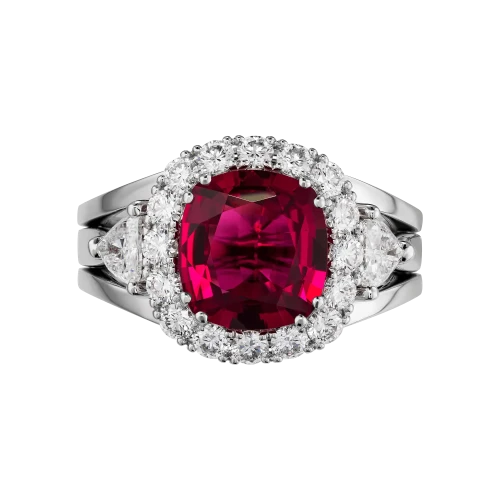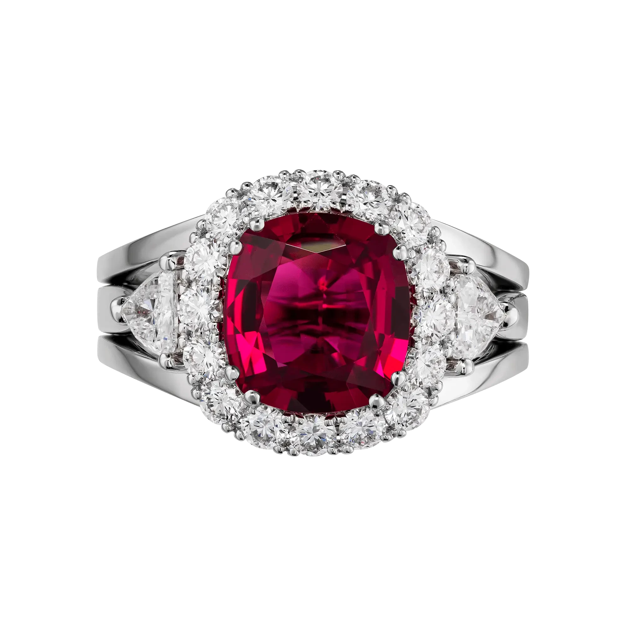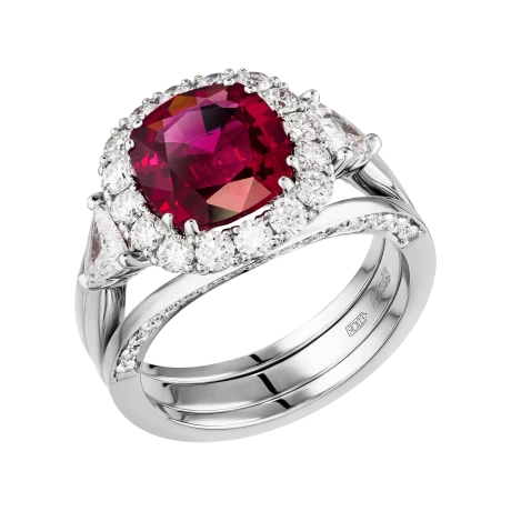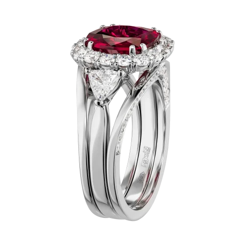 Мастера Maxim Demidov подчеркнули благородство шпинели ореолом безупречных бриллиантов, обрамляющих камень в роскошной оправе из белого золота. Контраст холодного блеска металла и тёплого сияния шпинели рождает ощущение дыхания света, будто в её глубине живёт пульс самой энергии.