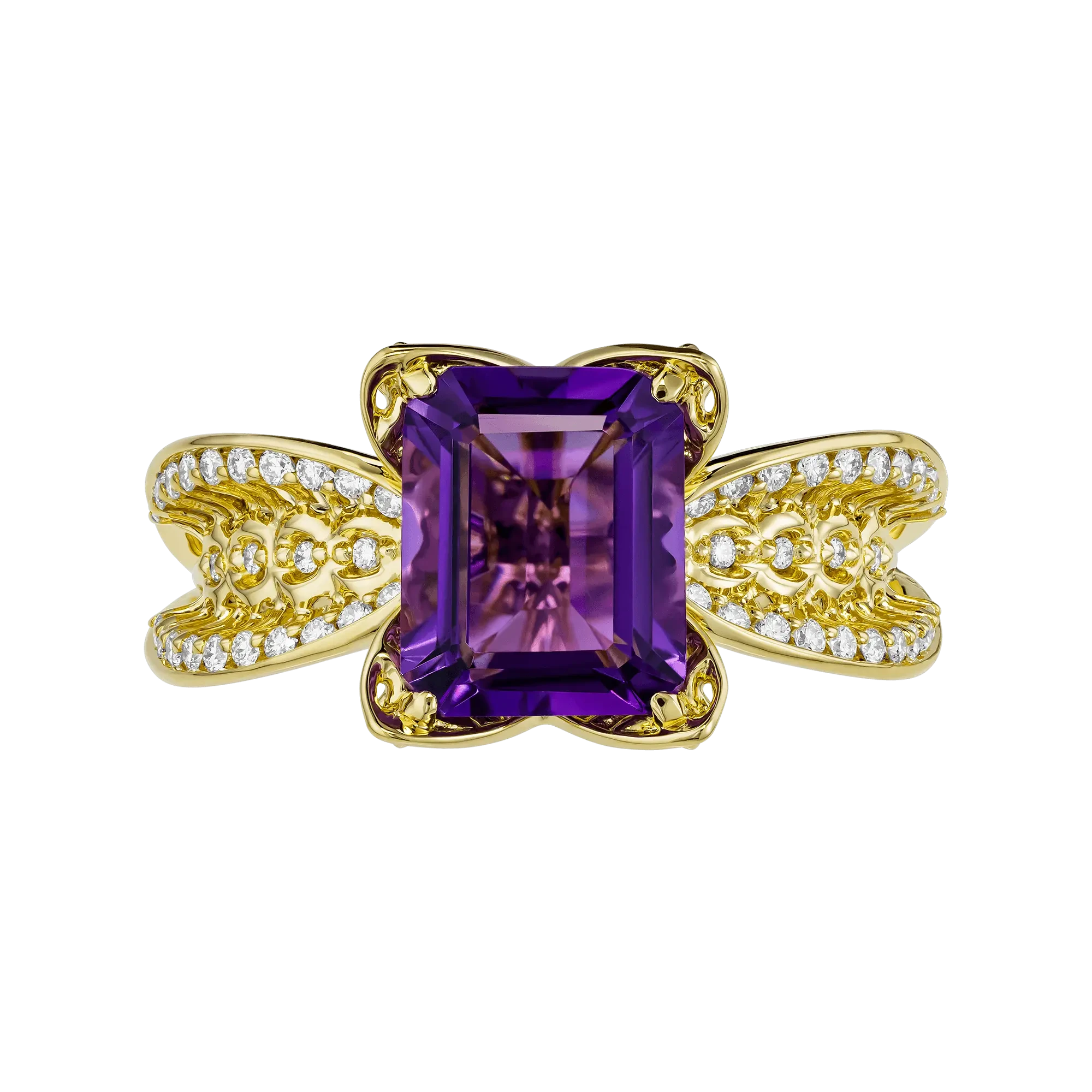Оправа из жёлтого золота поддерживает центральный камень тёплым сиянием, создавая гармоничный контраст с холодной палитрой аметиста. Бриллианты, рассыпанные по боковым элементам, добавляют деликатное мерцание, словно отражая свет на пути вперёд.