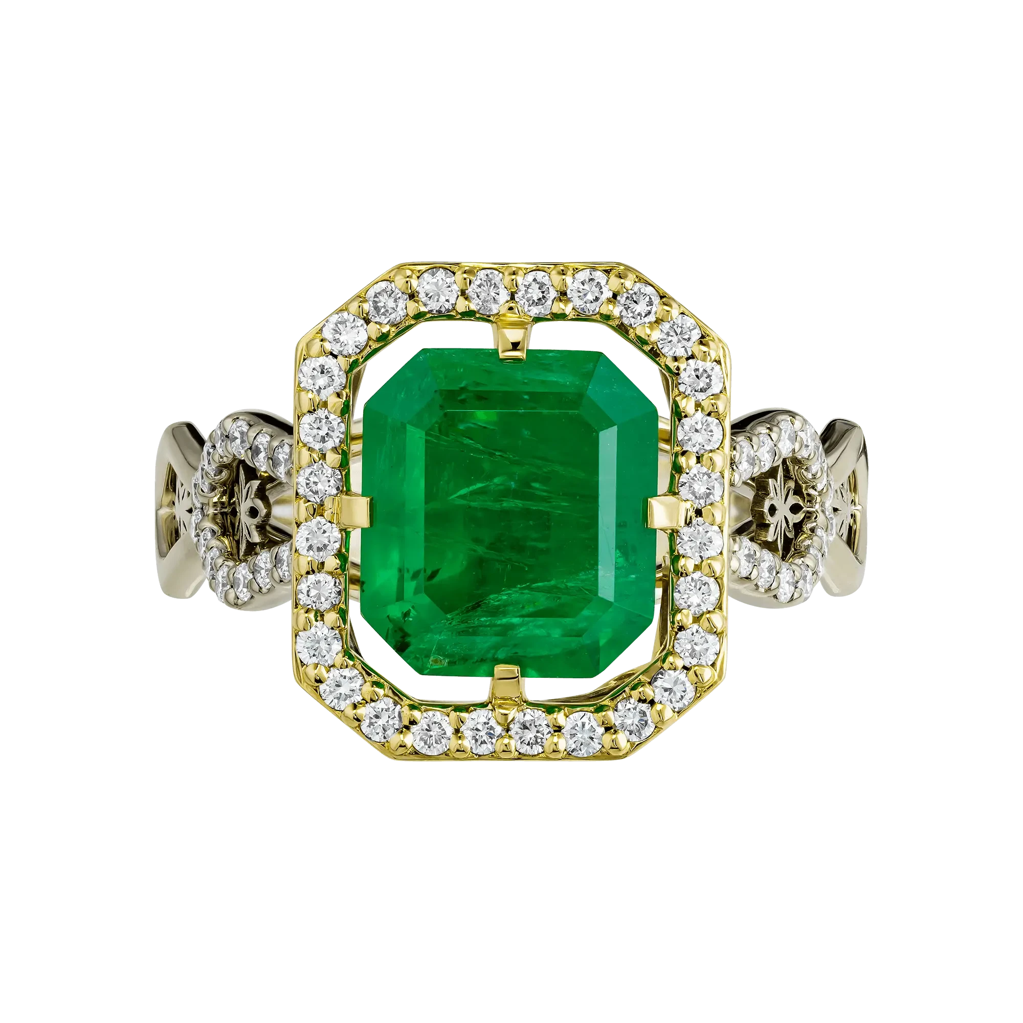 Композиция решена в виде возвышающейся конструкции, увенчанной изумрудной площадкой. Бриллиантовые линии, словно выверенные маршруты, поднимаются по поверхности оправы, направляя взгляд к центральному камню и формируя ощущение движения и собранной энергии. Свет, рассыпанный в линиях жёлтого и белого золота, усиливает глубину формы и подчёркивает архитектурный характер украшения.