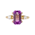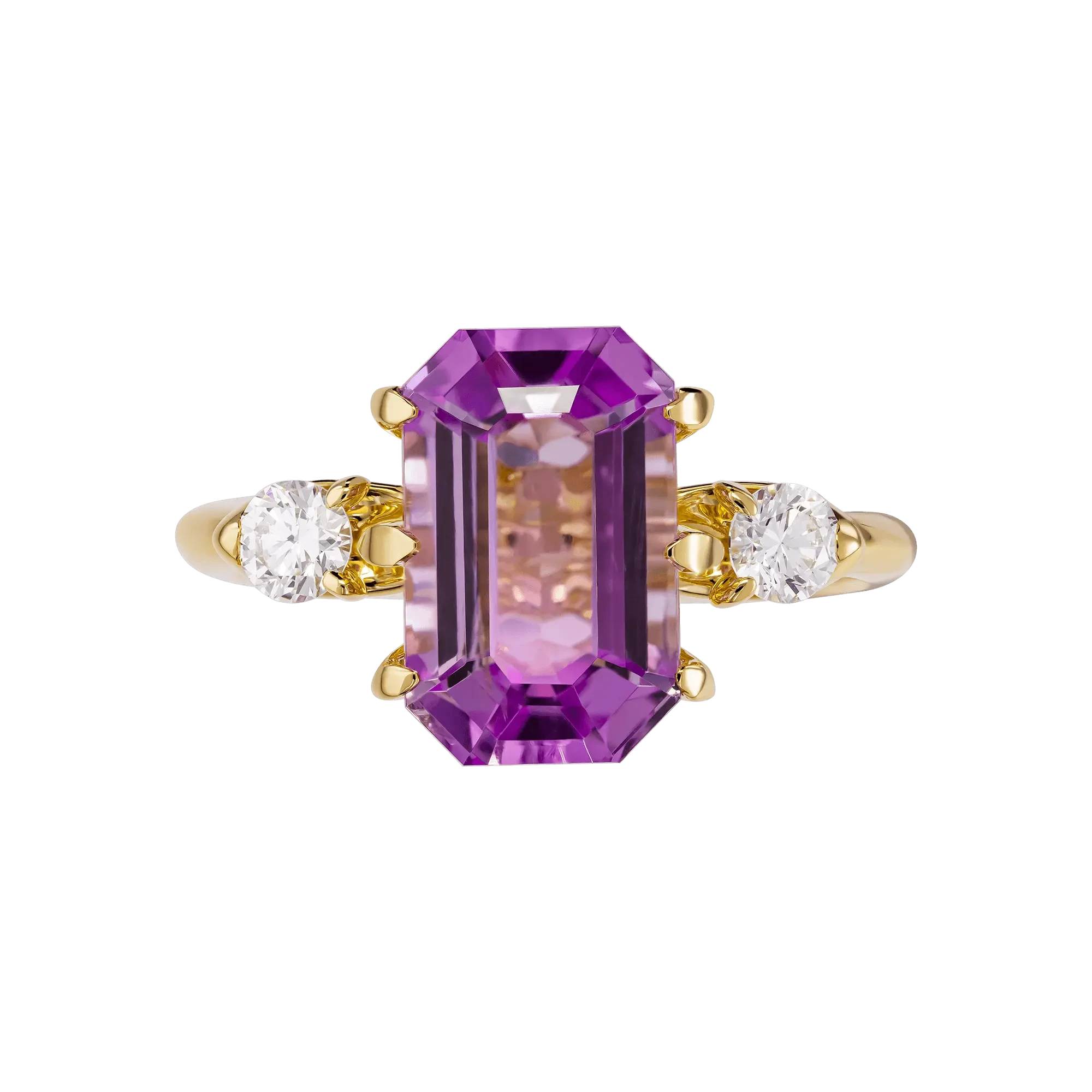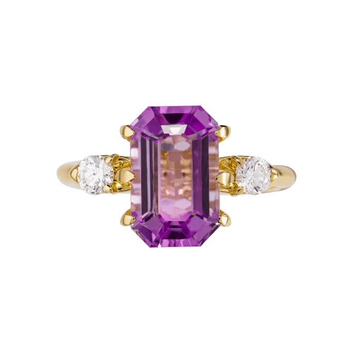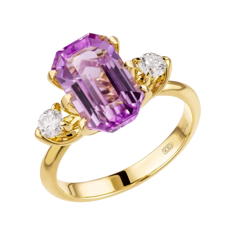 В центре сияет бразильский кунцит весом 4,96 карата – природный камень, поражающий своим сиренево-розовым свечением. Его прозрачные грани улавливают свет и рождают тонкую игру оттенков, напоминающую трепетные строки поэзии. Два бриллианта по бокам становятся акцентами в этой гармоничной композиции, подчёркивая красоту основного самоцвета и создавая образ завершённости.