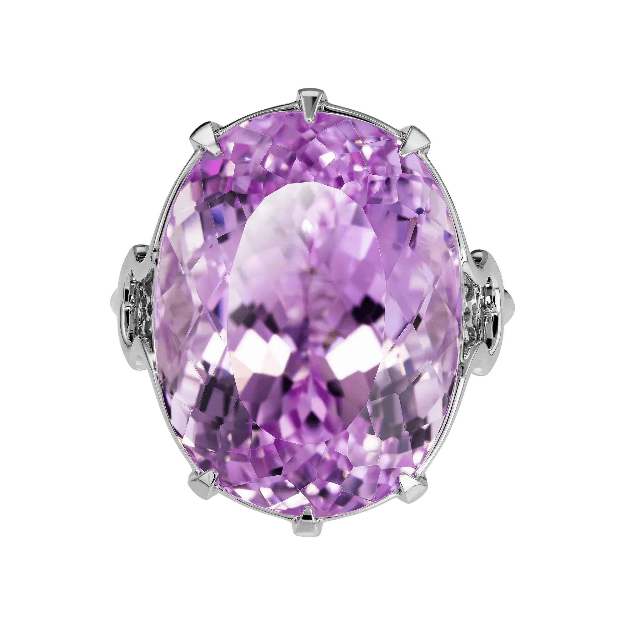 Оправа из белого золота выстроена предельно лаконично и работает как точная архитектурная поддержка. Она не замыкает самоцвет, а оставляет его открытым свету со всех сторон, позволяя кунциту проявить свои оптические свойства в полной мере. Такое решение требует безупречного расчёта пропорций и подчёркивает высокий уровень ювелирного исполнения.