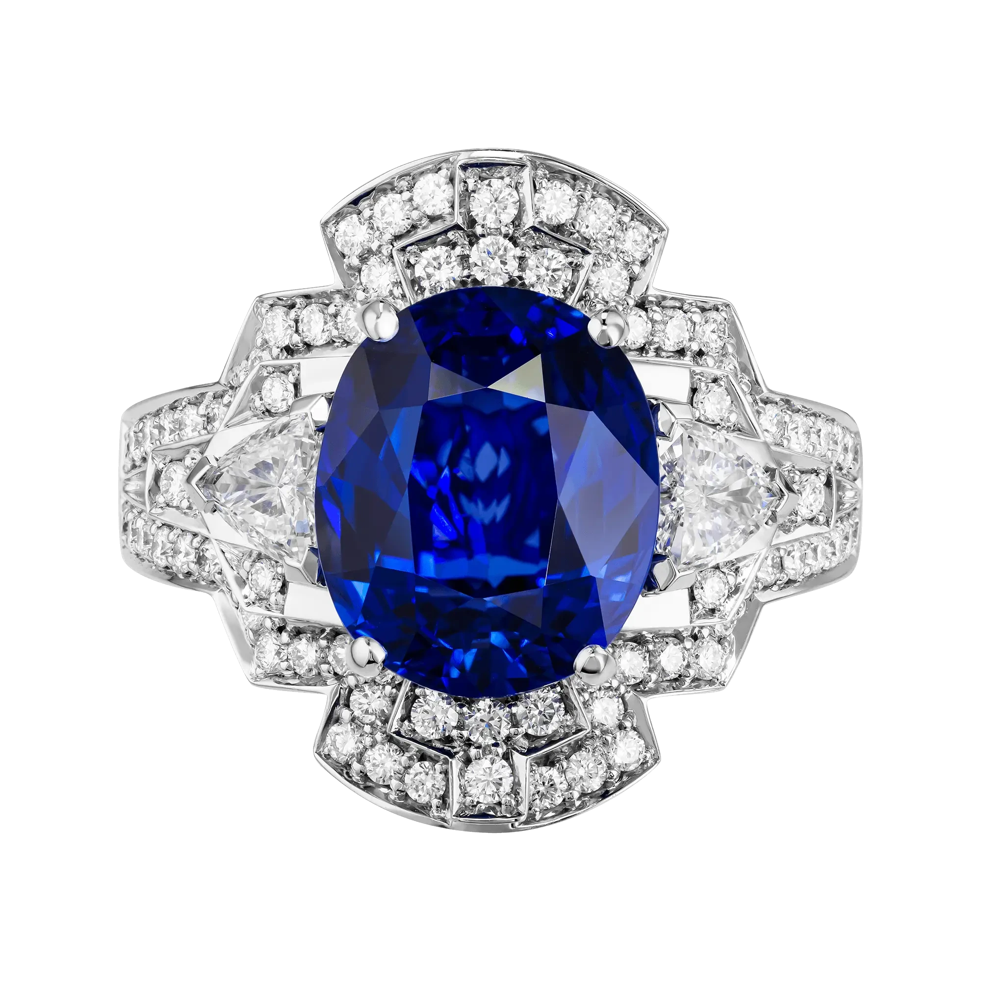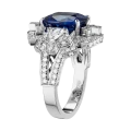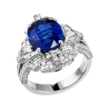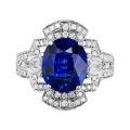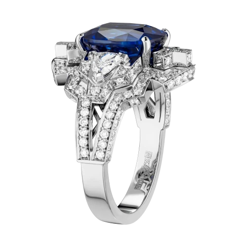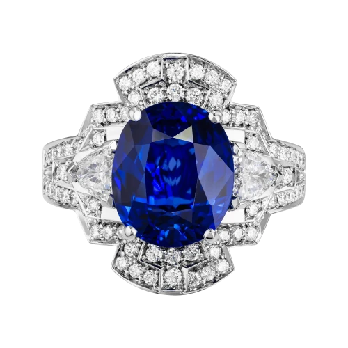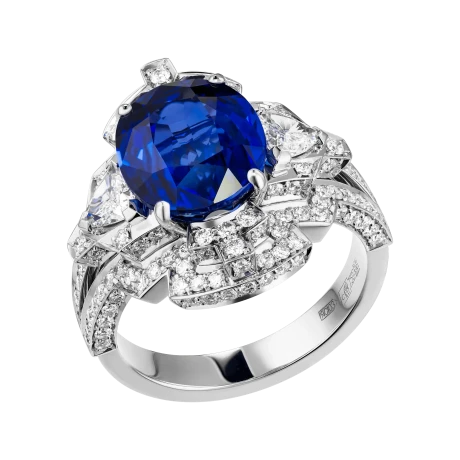 Белое золото оправы и сияние бриллиантов образуют изящный герб света, подчеркивающий величие центрального камня – сапфира цвета Royal Blue весом 6,02 карата, привезённого со Шри-Ланки. Этот оттенок – королевский синий – издавна считался символом верности, мудрости и власти. Он украшал мантии британских монархов и эмблемы орденов, включая Орден Подвязки – высшую награду короны.