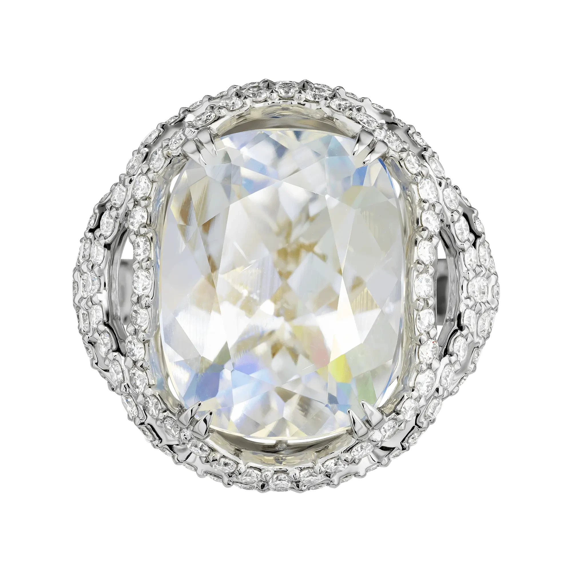 Ажурная оправа из белого золота подчёркивает центральный камень, не утяжеляя композицию. Более ста бриллиантов, инкрустированных по поверхности оправы, формируют световой ореол, усиливающий сияние лунного камня и создающий ощущение воздушности и пространственной лёгкости.