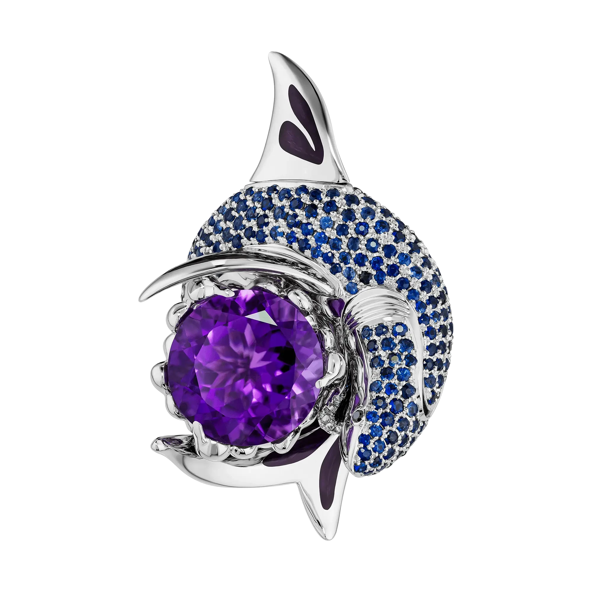Тело акулы покрыто синими сапфирами, выстроенными в ритмичную структуру, напоминающую переливы океанской толщи. Чёрные бриллианты в глазах придают образу сосредоточенность и характер, а плавники, покрытые горячей эмалью, подчёркивают пластичность и динамику формы.