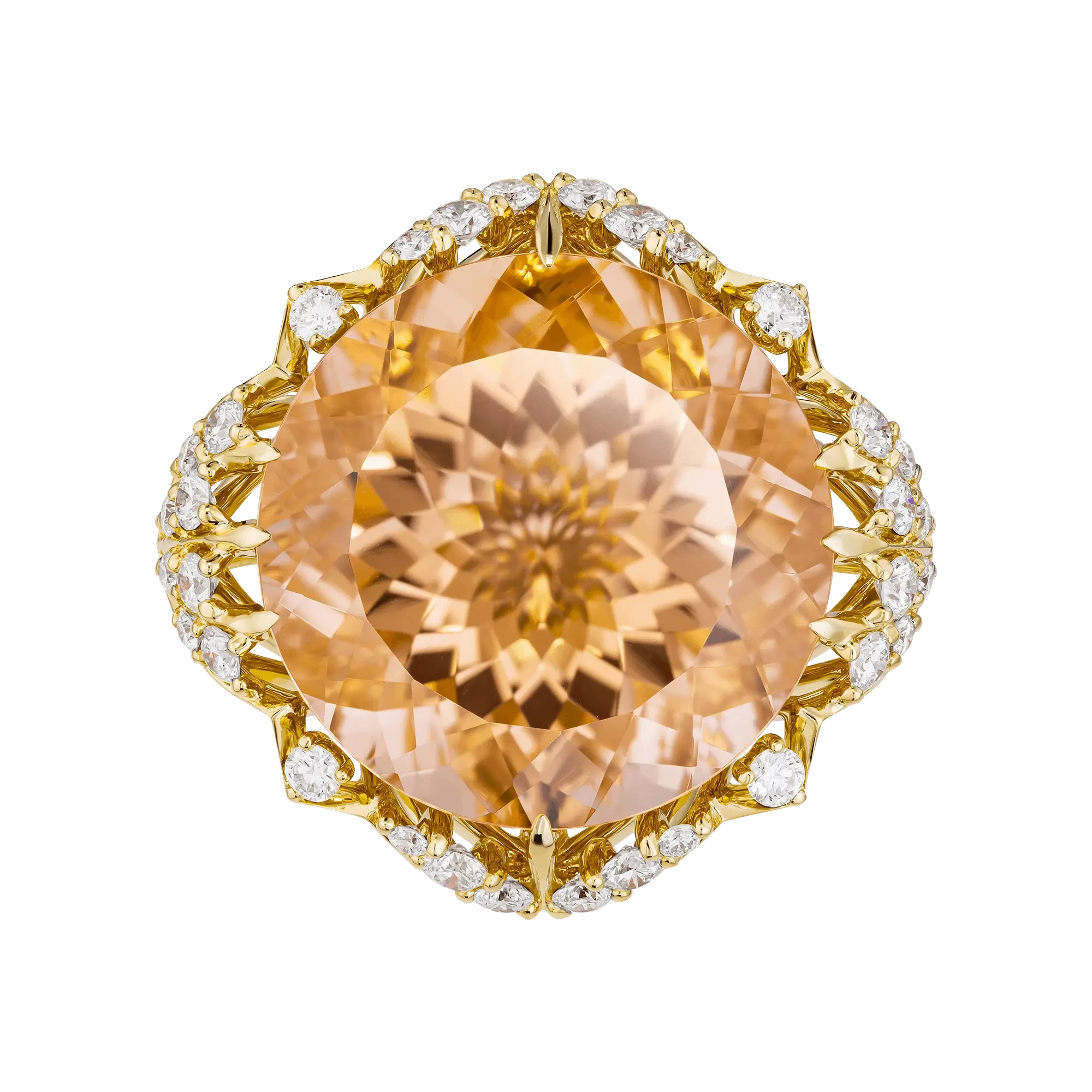Жёлтое золото оправы в окружении россыпи бриллиантов становится сияющим фоном, на котором самоцвет раскрывает всю свою воздушность. Бриллианты словно создают ореол вокруг морганита, усиливая впечатление парящего света и бесконечной гармонии.