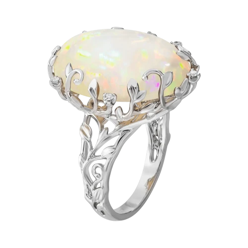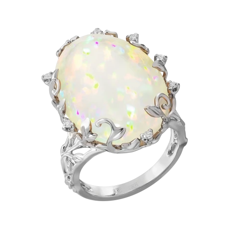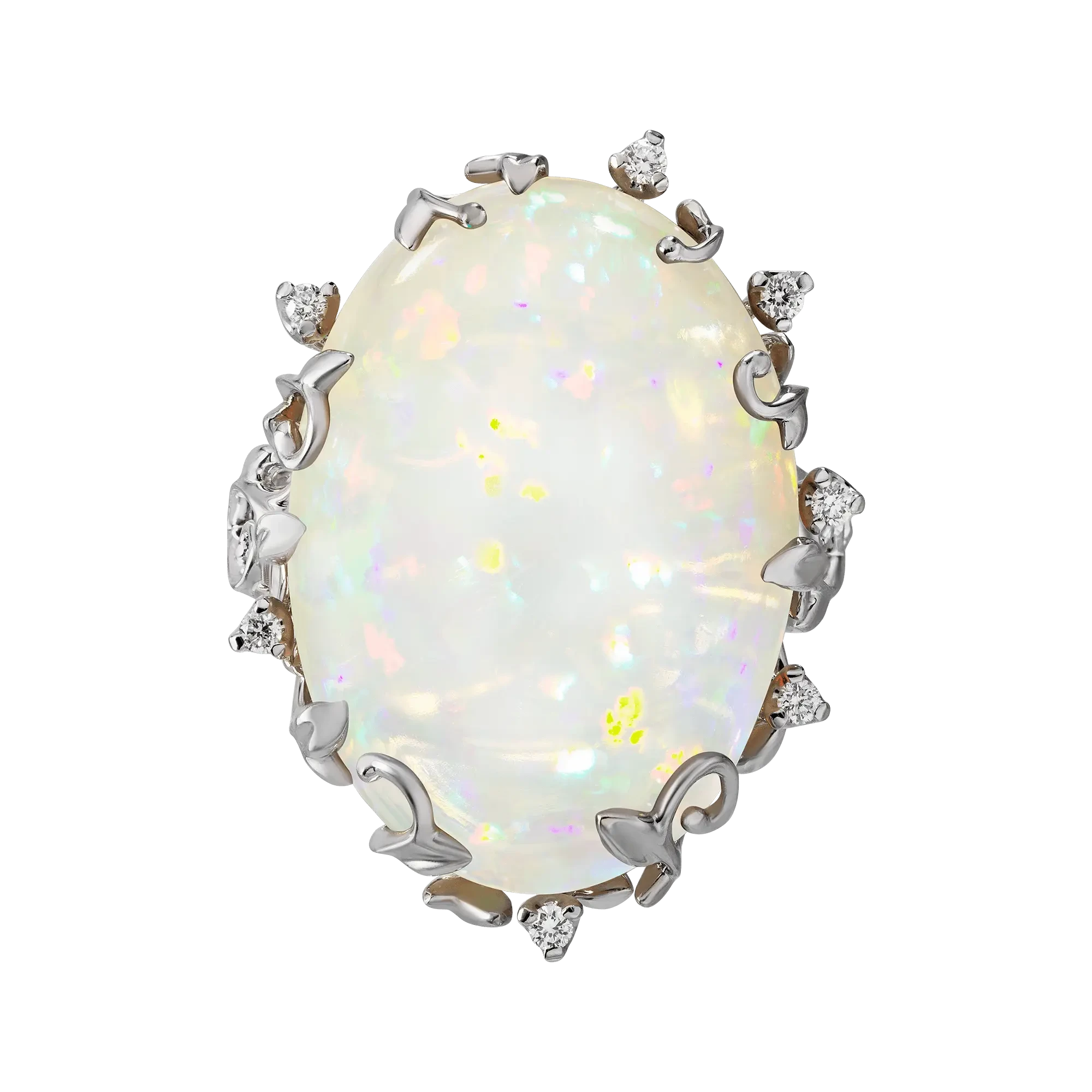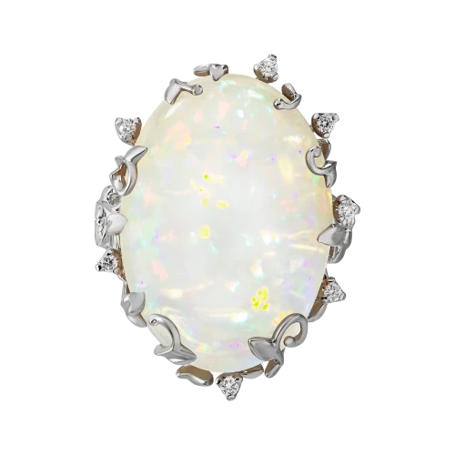 В сердце этого замысловатого переплетения сложносочиненной глянцевой основы, окруженный сверкающей бриллиантовой россыпью, центральное место занял крупный опал, добытый в глубинах Эфиопии. Из всего многообразия минералов, известных не одно тысячелетие, именно молочные самоцветы считаются сильнейшими талисманами, обладая силой и красотой, способной положительно влиять на жизнь владелицы.
