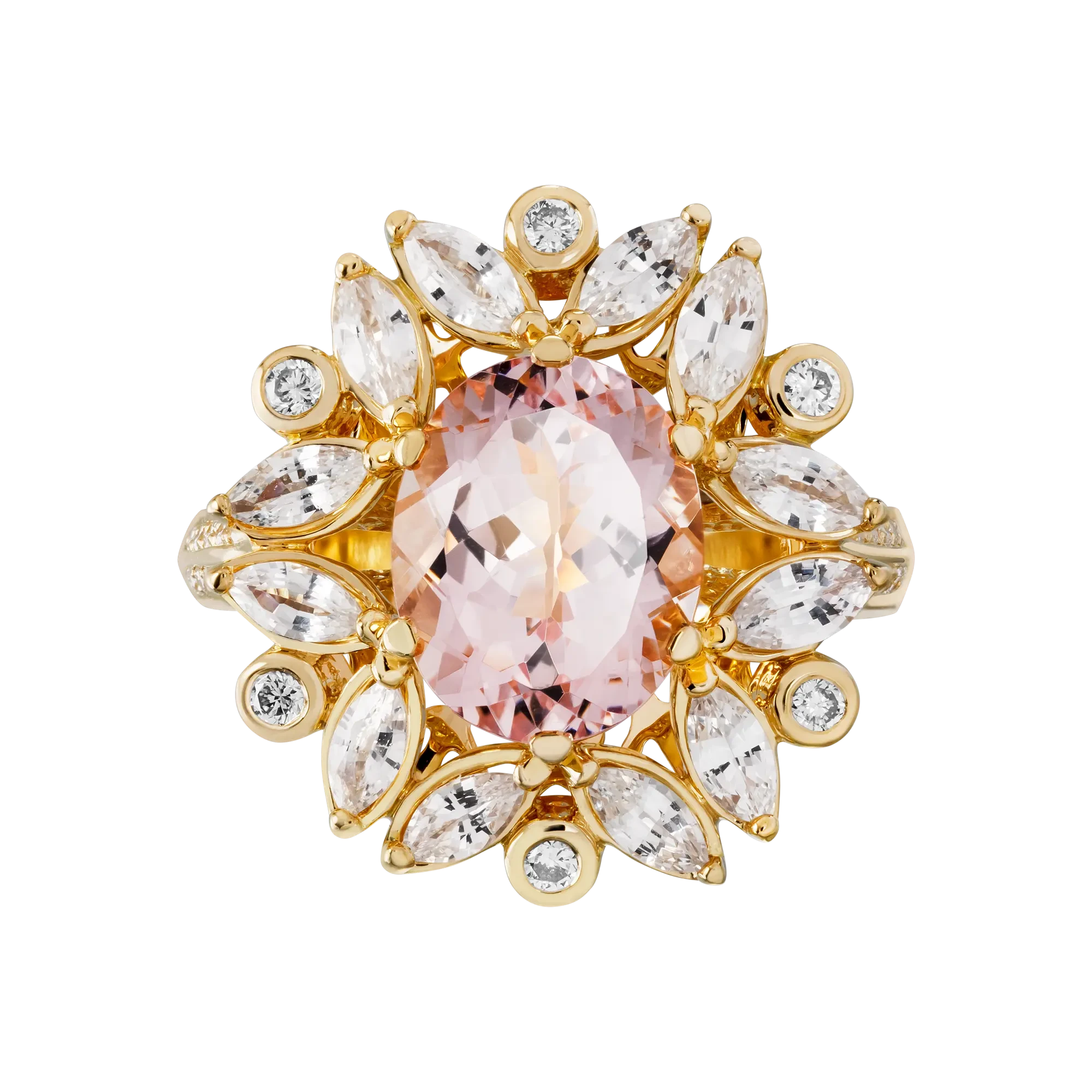 Очаровательное кольцо из желтого золота в форме цветка, ставшее плодом идеального сочетания фантазии и умелых рук, не было бы столь неподражаемым, если бы геммологи не нашли для него выдающийся морганит, занявший центральное место в сердце авторского украшения.