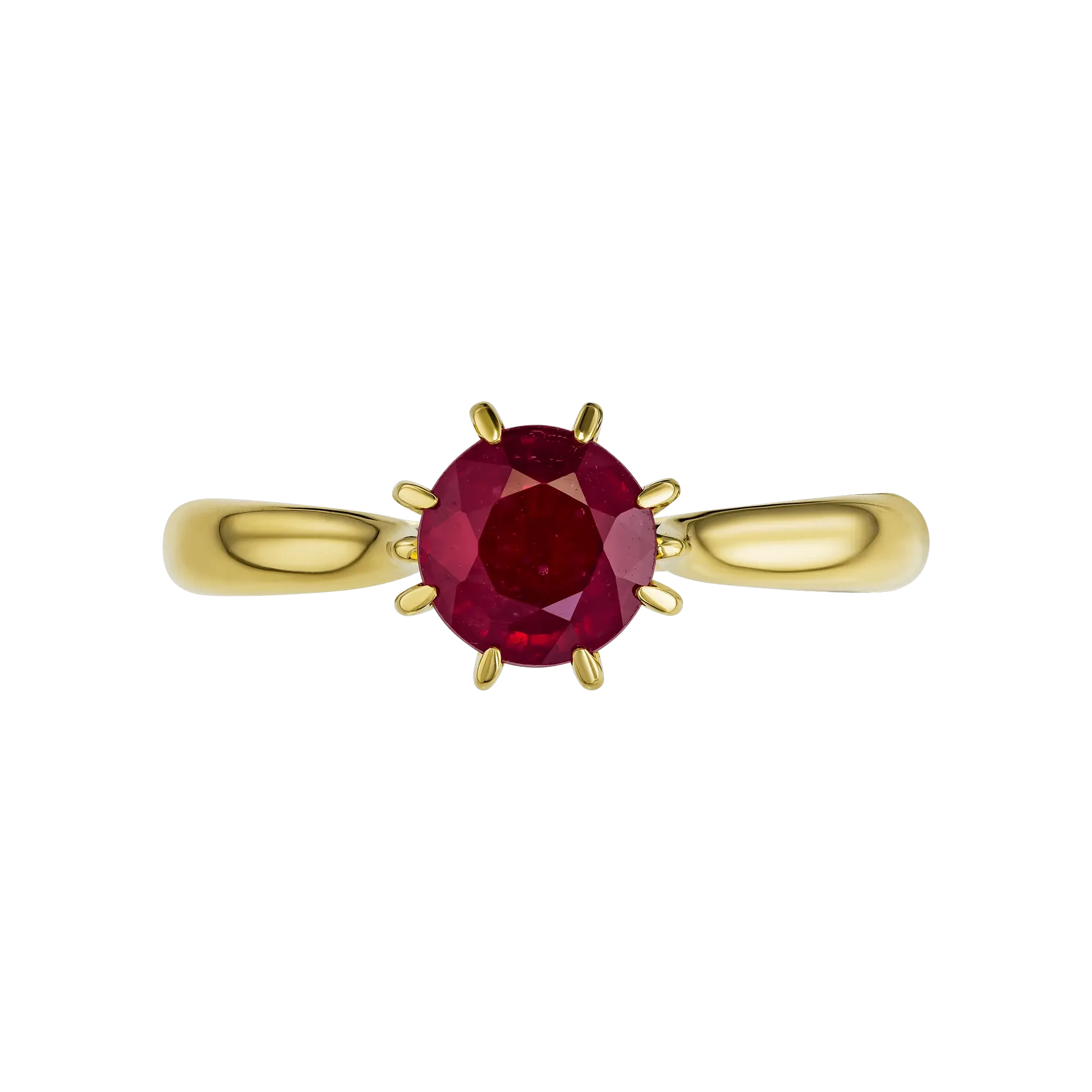 Оправа из жёлтого золота выбрана так, чтобы подчеркнуть природное тепло самоцвета: металл отражает оттенки камня, усиливает их и создаёт мягкое сияние вокруг центральной вставки. Лаконичная архитектура кольца делает рубин единственным смысловым центром — выразительным, ярким, но при этом удивительно элегантным.